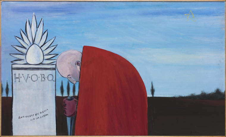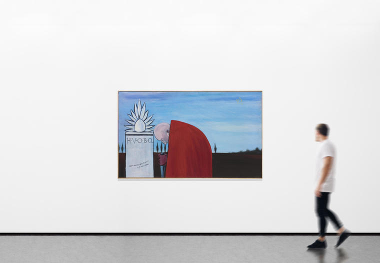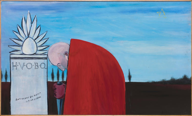 Андрей Филиппов наиболее известен своими работами с использованием элементов государственной символики, византийских и римских мотивов, а также аллюзиями на библейские сюжеты. В представленной на торгах полотне «Проклятие» 1987 года художник обращается к образной системе Римской империи. На фоне предрассветного пейзажа с мерным ритмом кипарисов вдоль линии горизонта изображен человек с кинжалом в руке. Он склонился у каменного надгробия с латинской аббревиатурой H.V.O.B.Q., что расшифровывается как Hic Volo Ossa Bene Quiescant — «Я хочу, чтобы мой прах здесь покоился с миром». Фигуру мужчины скрывает ярко-красный плащ — традиционный предмет одежды римских воинов. Ткань подобного оттенка очень ценилась и была символом удачи и бесстрашия перед вызовами судьбы, ко всему прочему, на красном были менее заметны пятна крови. Сгорбленная поза мужчины и процарапанная кинжалом, с трудом различимая, надпись на надгробии указывают на его недобрые намерения. Опираясь на название работы можно предположить, что художник запечатлевает акт мести или глубокое отчаяние главного героя.