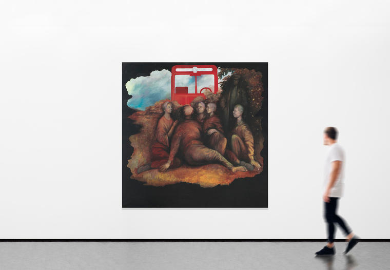 Представленное на торгах полотно Игоря Меглицкого является частью проекта, в котором художник обращается к стилистике знаменитой Федоскинской лаковой миниатюры. Этот народный промысел по росписи шкатулок возник в конце XVIII века в подмосковном селе Федоскино. Название работы «Бежин луг» отсылает к сюжету одноименного рассказа из «Записок охотника» Ивана Сергеевича Тургенева. Художник изображает мальчишек, отправившихся стеречь табун лошадей, которые до рассвета рассказывали друг другу страшные истории о русалках, домовых и прочей сказочной нечисти. Меглицкий привносит в композицию яркий цветовой акцент в виде красного геометризированного трактора, стоящего на фоне пасторальной по своему характеру сцены. Темный силуэт мужчины в плаще, стоящего поодаль от группы оживленно беседующих ребят, намекает на трагическую судьбу одного из героев рассказа. По словам соседа Меглицкого по мастерской — Алексея Таранина, черное обрамление композиции должно было заполниться широким золотистым узором, но полотно не было закончено.