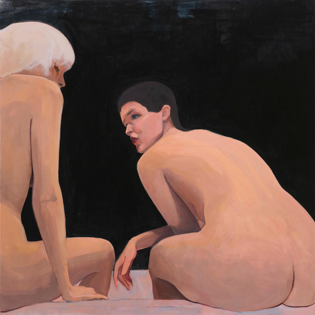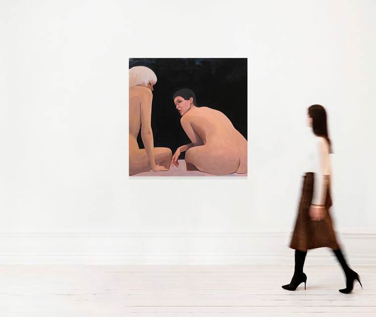 « “Слушай…” — работа из “женской” серии. В ее основе лежат воспоминания бытовых сцен и переживаний из моего детства, которое пришлось на 1990-е годы. Подслушанный диалог в бане, где подруги делятся сокровенным — воссозданная профессиональными актрисами сцена, где я выступаю в роли режиссера-художника, уделяя особое внимание эмоциональному выражению героинь. Они делятся сокровенным, заполняя большую часть пространство холста, а зритель невольно оказывается вовлеченным в тайную беседу».