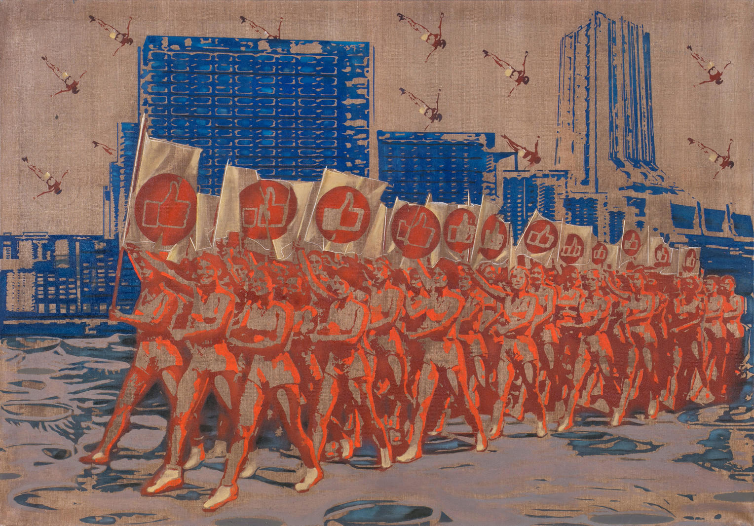 “Настоящий ретро футуризм”, — метко определил такие произведения Сергей Бархин. С раскинутыми как крылья руками “взлетающие” или “пикирующие” люди Евдокимова, то ли Гелиосы, то ли Икары, парят в свободной левитации между небом и землей, между прошлым и будущим, между удручающей фантазией и радостной мечтой. Их почти невесомая стройная, но при этом физически безупречная субстанция создает атмосферу бесчисленных и нескончаемых “полетов”, как бы плакатно постулируя этот вид футуристического передвижения в пространстве.
