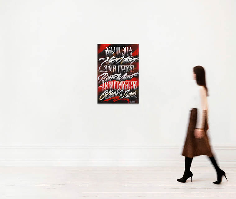 Работа относится к серии экспериментов с каллиграфией. Произведение выполнено в смешанной технике. Фон сделан в технике спрей, а каллиграфия — кистью акриловыми красками».