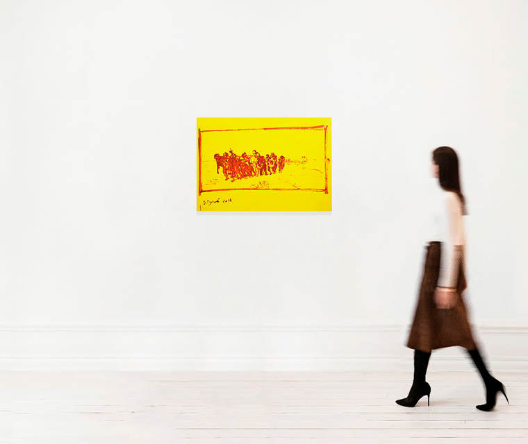 В представленной на торгах работе 2016 года Дмитрий Гутов продолжает цикл произведений, вдохновленных шедеврами русской живописи. На этот раз он обращается к знаменитому полотну Ильи Репина «Бурлаки на Волге» (1870–1873) из собрания Государственного Русского музея в Санкт-Петербурге. В интерпретации Гутова бурлаки становятся единой, плотной массой, среди которой выделяется светлая фигура самого молодого из мужчин. Он гордо вздернул голову, готовясь сбросить с себя тяжелую ношу. Повторяя композицию Репина, художник мастерски опускает детали, подчеркивая наиболее выразительные решения предшественника.