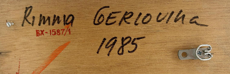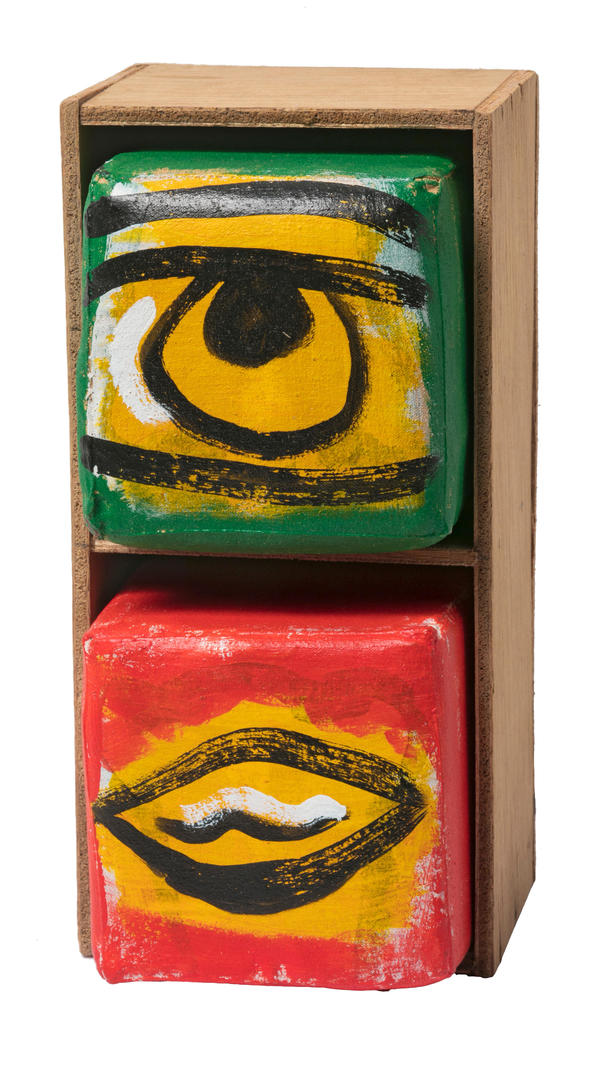 В 1979 году Римма Герловина вместе с мужем переезжает в Нью-Йорк и становится частью эмигрантского арт-сообщества. В начале 1980-х она начинает серию «Кубические организмы»: из кубиков, содержащих буквы, слова и изображения составляются фигуры людей, реализуя упомянутую выше постмодернистскую идею о человеке как тексте, составленном из набора базовых элементов. Представленная работа 1985 года принадлежит именно к таким объектами и напоминает нечто детское, игровое. При этом постмодернистская «игра» ограничена двумя ячейками, кубики в которых можно менять местами.