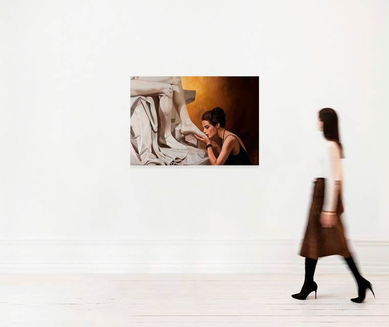«В этой работе арт-группа Doping Pong визуализирует формулу любви к искусству через образ преданной поклонницы бесценного шедевра. Скульптура оказывает на героиню настолько гипнотический эффект, что вынуждает склониться и припасть поцелуем. Выбор объекта для поклонения не случаен: на картине изображен узнаваемый фрагмент “Пьеты” Микеланджело — авторы сознательно применяют цитирование одного из самых известных религиозных изображений эпохи Возрождения. Таким образом, вполне светская любовь к искусству благодаря именно этому произведению перерастает в религиозный культ. Да и сама героиня картины вызывает ассоциации уже не с современной любительницей искусства, а с персонажами Евангелия от Иоанна или картины Боттичелли, живописующей оплакивание Христа. Тем самым картина превращается в яркую иллюстрацию того, что Творчество, которому многие поклоняются с религиозным фанатизмом и считают главным божественным даром, сравнимо с поклонением Богу.