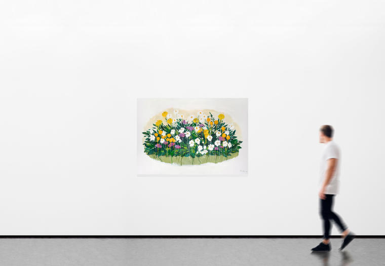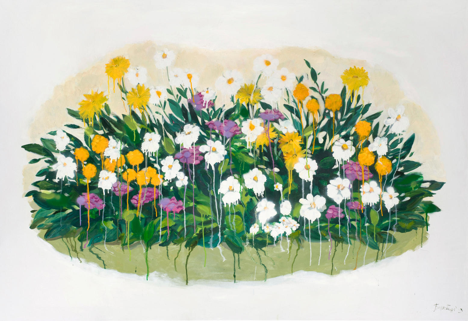 «Около полугода делала эту работу, переписывал около 6 раз. Она задумывалась как увеличенная акварельная иллюстрация, у нее акварельная подложка. Но акварель в таком размере не сработала и затем был проработанный реализм, который тоже был очень скучным, работе не хватало легкости, летней непринужденности. В этом году я много экспериментировали с аэрозолью, добавляя ее на холст, здесь в какой-то момент я просто переписала все из баллончика. Затем нашла золотую середину и добавила яркие пятна с размытым контуром и потеки «нектара» — перенасыщение цвета в картине, вытекание его из холста. На работе изображены абстрактные цветы, яркие и разноцветные, летние, большие и маленькие, высокие и низкие, полевые, самые обычные, разнотравье».