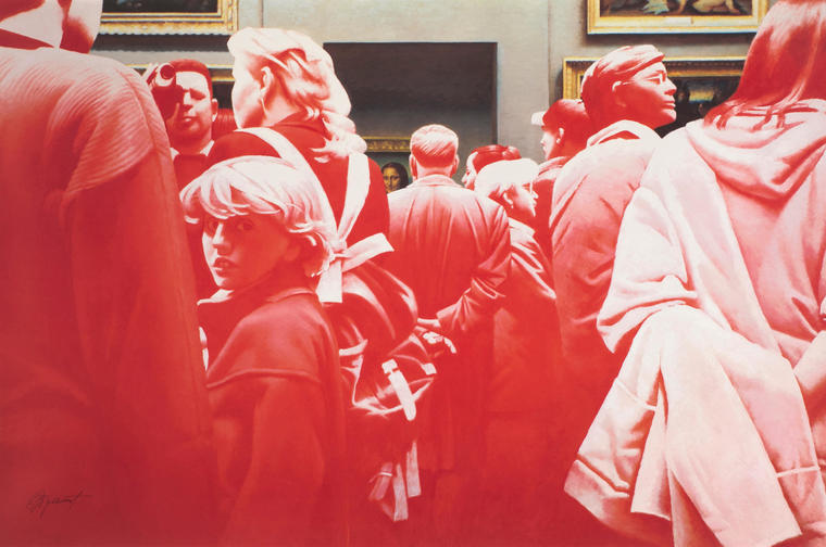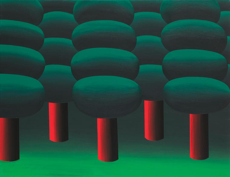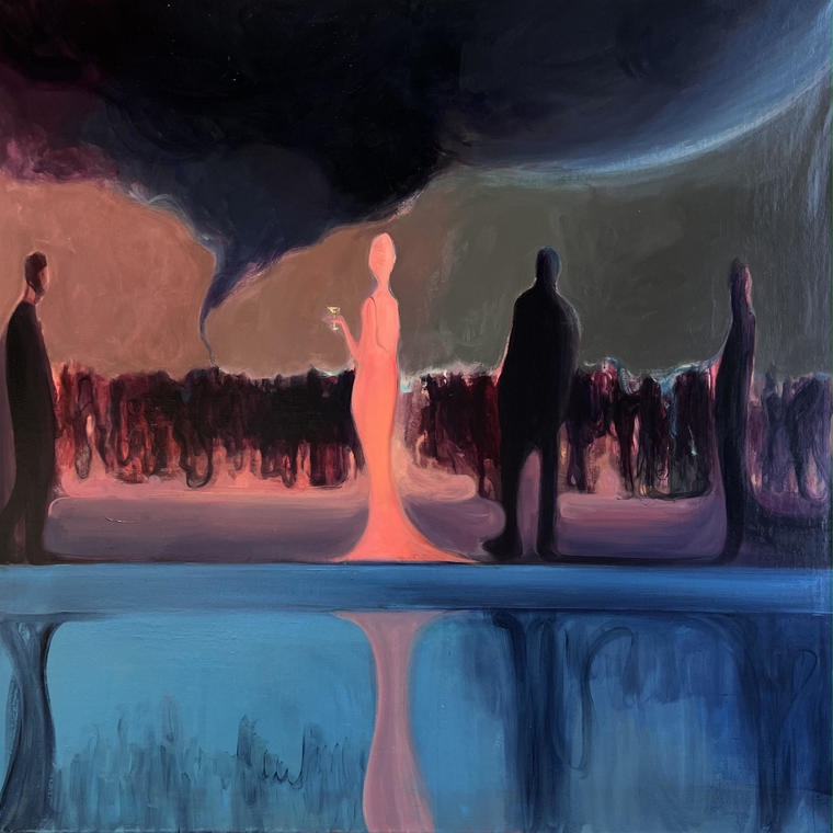 В творчестве Яна Рычего часто встречаются абсурдные, по-детски наивные образы, однако за их непосредственностью скрывается глубокое размышление на серьезные темы, политические, социальные и духовные. В представленной работе на ярком абстрактном фоне возникают графичный силуэт девушки. Благодаря особой авторской технике образ создает иллюзию движения: кажется, зритель вот-вот услышит голос героини. Яркий колорит и шутливое настроение всей работы контрастируют с удивленным выражением лица. Когда медиапространство все больше наполняется новостями о запретах и ограничениях, Ян Рычий говорит о полной свободе в высказываниях и в проявлении своих чувств. «Чем чаще говорят "нельзя", тем громче будет смех», — считает художник. V