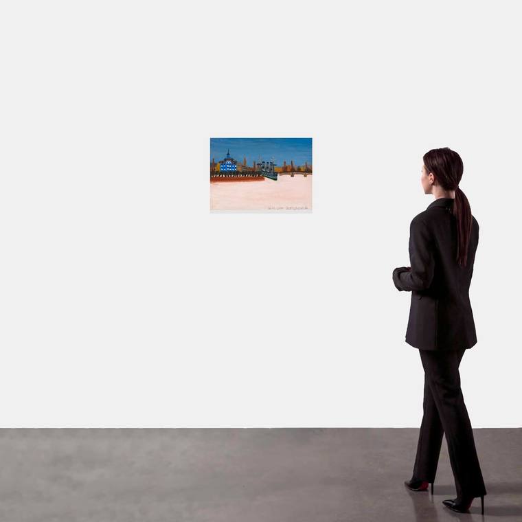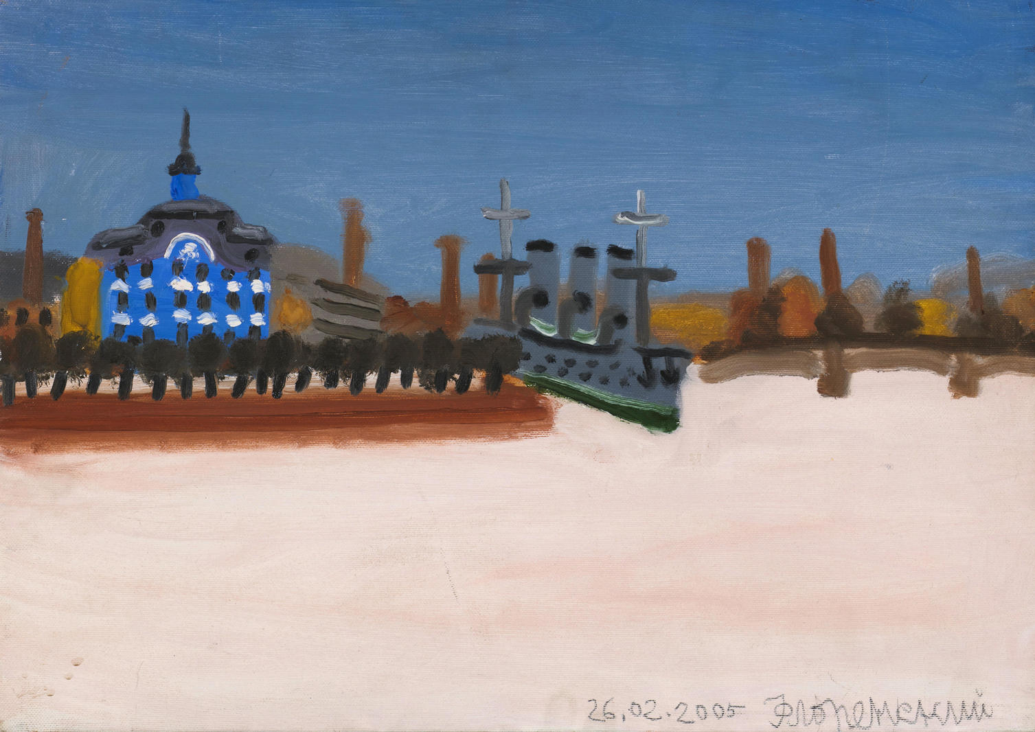 «В феврале, марте и мае 2005 года (на январь и апрель, к сожалению, выпали многочисленные путешествия) я нарисовал с натуры несколько серий городских пейзажей, используя для работы виды из некоторых доступных мне окон. Пейзаж с крейсером “Аврора” — один из большой серии зимних и летних видов из окна дома, где когда-то жил маршал Кутузов (на Кутузовской набережной). Надо сказать, что рисование картин с натуры представляется мне сегодня занятием довольно оригинальным, чрезвычайно актуальным и, к тому же, весьма приятным. Призываю всех остальных художников последовать моему примеру и незамедлительно нарисовать какой-нибудь пейзаж, портрет или, на худой конец, натюрморт».