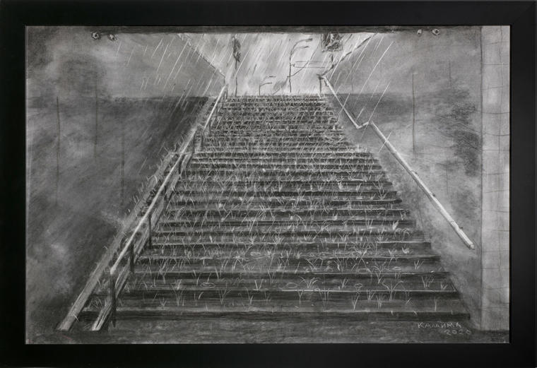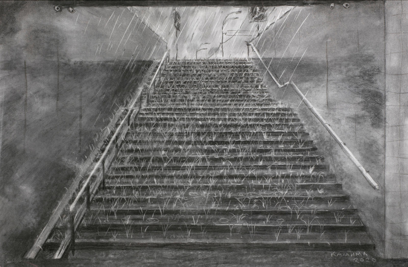Монохромность с использованием только угля и сангины — визитная карточка Алексея Каллимы. В таких работах он сосредотачивается на форме, пластике, динамике, стремится к выражению экспрессии момента. Как мы видим, Алексей Каллима живет собственным ритмом, проговаривая некую тему и переходя к другой. V