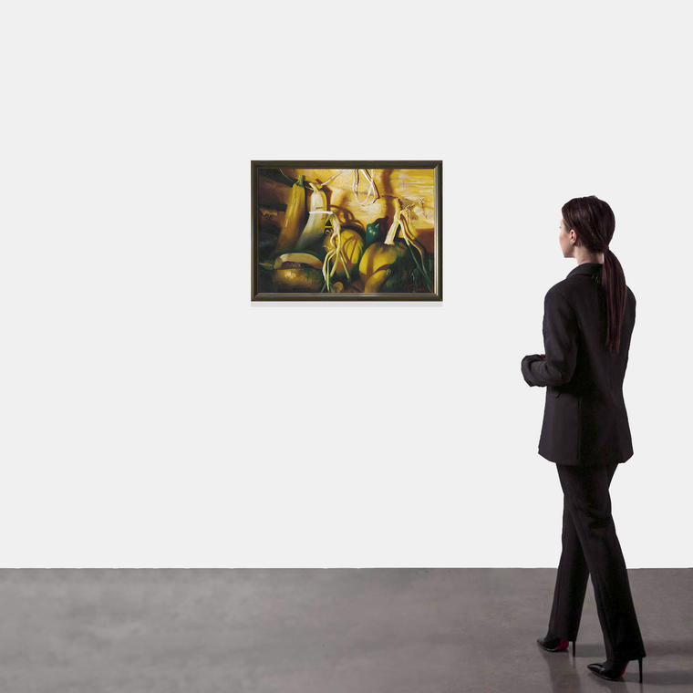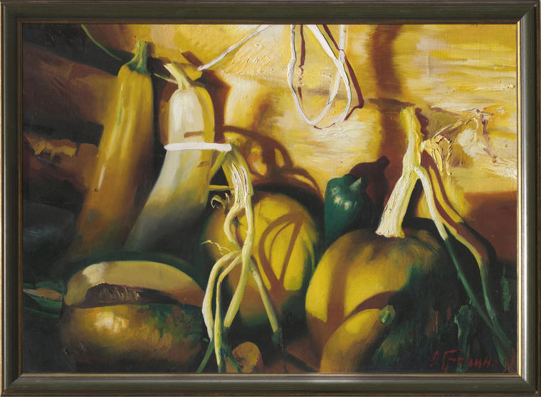 В представленной картине авторская техника работы со светом соединяется с гиперреалистичной манерой письма. Ольга Гречина создает медитативную осеннюю композицию с тыквами. Художница работает маслом на холсте, но легкость и быстрота наложения мазков сравнима с техникой акварели. Она соединяет традиционные «осенние» оттенки: выбранная гамма позволяет создать пространство, наполненное воздухом и светом.