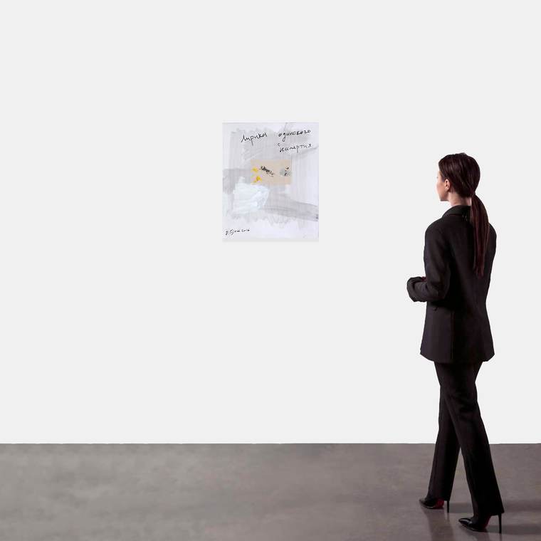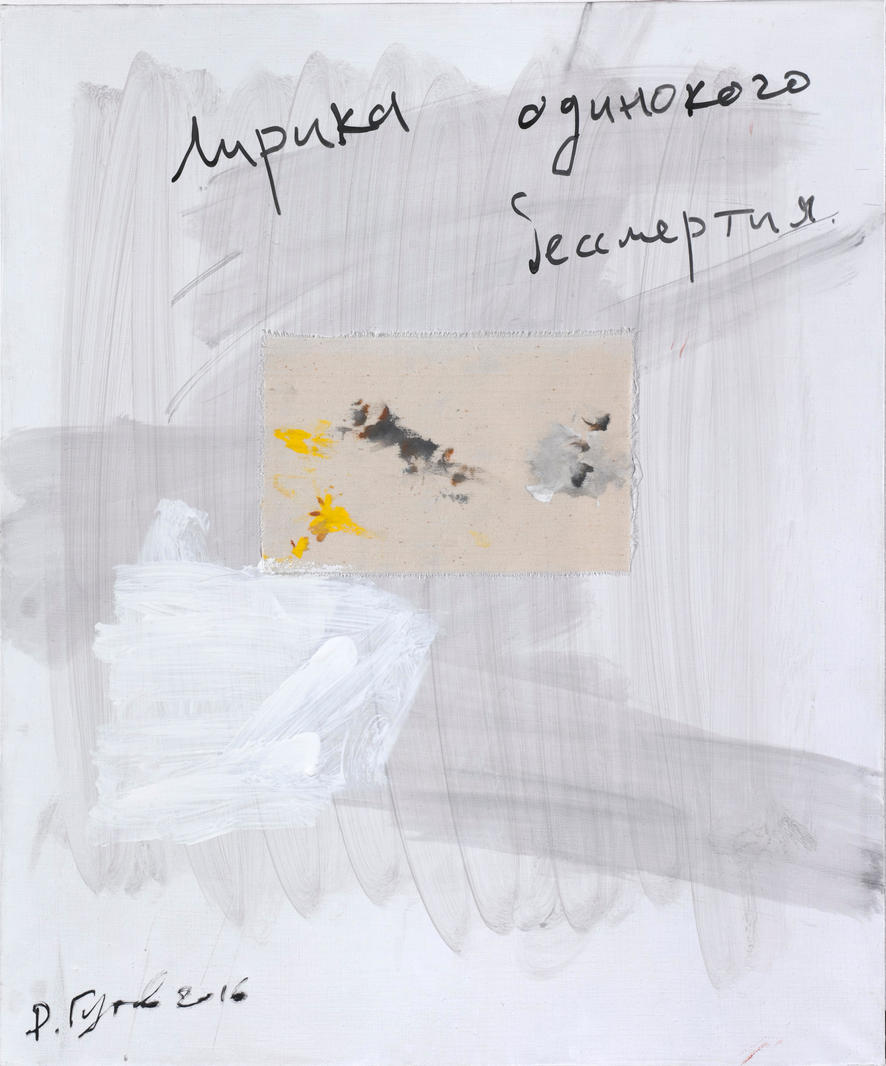 У Дмитрия Гутова есть проект «Институт Лифшица». Он с начала 1990-х годов занимается художественными исследованиями, превращая философа, теоретика и историка культуры Михаила Лифшица в художественный проект. Фраза «Лирика одинокого бессмертия», вынесенная на холст из небольшой абстрактной серии, из одного текста Лифшица. «Так он описывает тексты Ветхого завета. Самоощущение Яхве», — говорит художник.