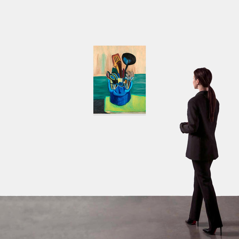 В своей творческой практике Сергей Скутару обращается к эстетике повседневности, фиксируя детали и сюжеты обыденной жизни, которые часто остаются незамеченными. В представленной на торгах работе художник останавливает взгляд зрителя на простейшем бытовом объекте — стакане с кухонными приборами. Полотно выполнено в характерной для Скутару экспрессивной живописной манере и яркой цветовой гамме. Художник создает кинематографический эффект расфокусированного кадра, будто мимолетно брошенного взгляда на обыденный предмет, который каждый может найти у себя дома, но редко обращает на него внимание.