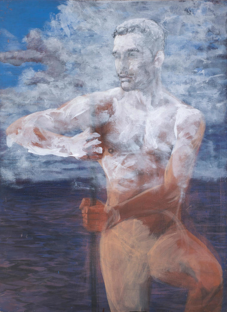 На доске изображена лодка с большой компанией, поверх которой в густом синем небе нависает портрет, поддерживаемый с двух сторон обнаженными мужчиной и женщиной. Этот сюжет, как и многие у Пурыгина, заставляет нас гадать о личности изображенных и смысле, который заключен в данной композиции. Можно попробовать расшифровать это, отталкиваясь от изображения лодки. Как известно, огромную роль в становлении Леонида Пурыгина сыграло его знакомство со скульпторами-нонконформистами, состоявшееся в конце 1970-х годов: Борисом Орловым, Дмитрием Приговым, Леонидом Соковым. Встречи в мастерской на улице Рогова, разговоры о полистилистичности, многоязычии в искусстве, использование цитатности — все это, несомненно, имело очень важное, едва ли не определяющее значение для самоопределения художника. Под влиянием обсуждений, дискуссий, квартирных выставок у Пурыгина складывается авторское самосознание, которое и отличает искусство от графомании. Это — та же стратегия, что и в соц-арте, только если, например, Виталий Комар пишет портрет жены с ребенком в стиле агитпропа, то Пурыгин создает свой автопортрет с женой в манере лубка, самодельных икон.