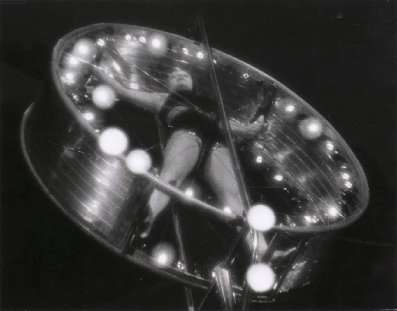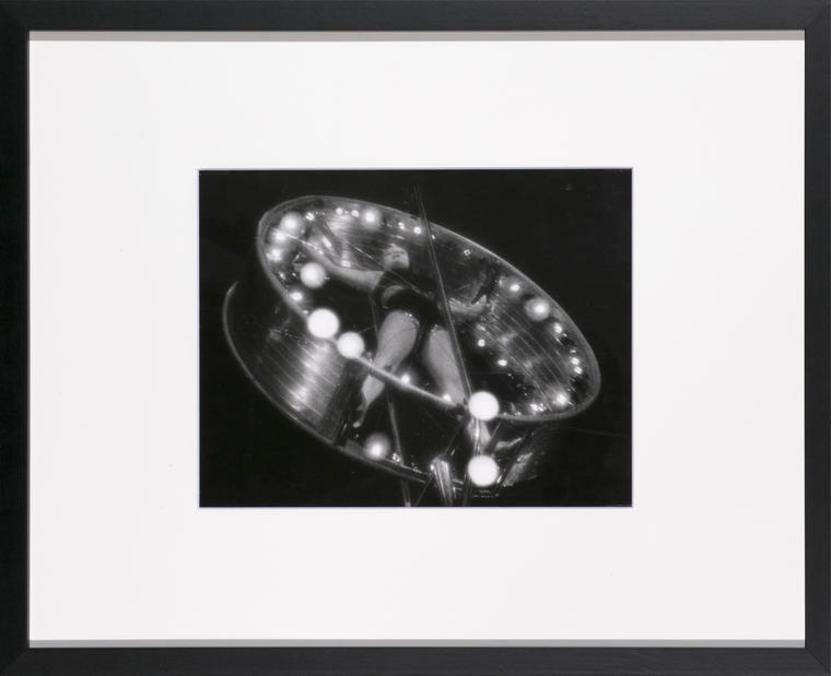 «Рейнское колесо» — известный цирковой номер: акробатка вращается в колесе, укрепленном на пятиметровом металлическом шесте – перше, который держит на лбу стоящий на арене артист. Родченко-конструктивист отсекает всё лишнее, оставляя в кадре только скомпонованное по диагонали колесо с акробаткой, Родченко-пикториалист светом подчеркивает волшебство происходящего.