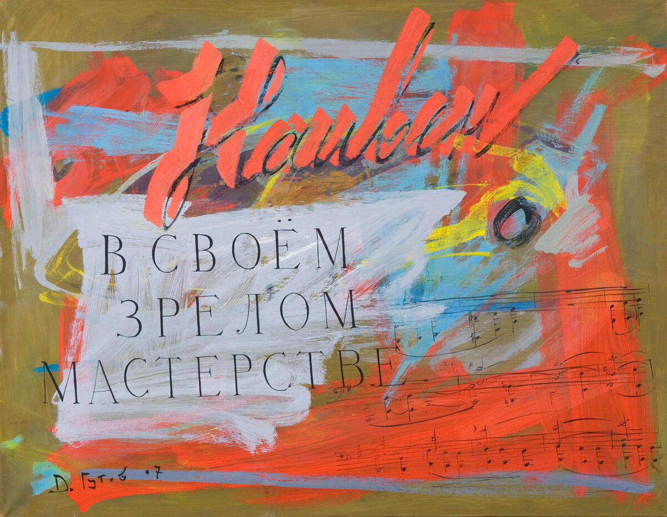 Представленная на торгах работа — смесь традиционных и узнаваемых образов в искусстве Дмитрия Гутова. Надпись «Наивен в своем зрелом мастерстве» выведена канцелярским шрифтом «с засечками», словно с обложки книги, и свободным курсивом. Эта эстетика одновременно нарочито небрежна и изящна, она притворяется дилетантской, но по сути является выплеском медитативного опыта и квинтэссенцией практически дзенского равновесия в жизни и на холсте. Разгадка — в цитате, которую Гутов извлек из из древнекитайского трактата: то, что внешне выглядит как детское и наивное, требует невероятно опыта и мастерства. Недаром художник часто говорит, что его любимый персонаж — китайский каллиграфист-дилетант, работающий в свое удовольствие.