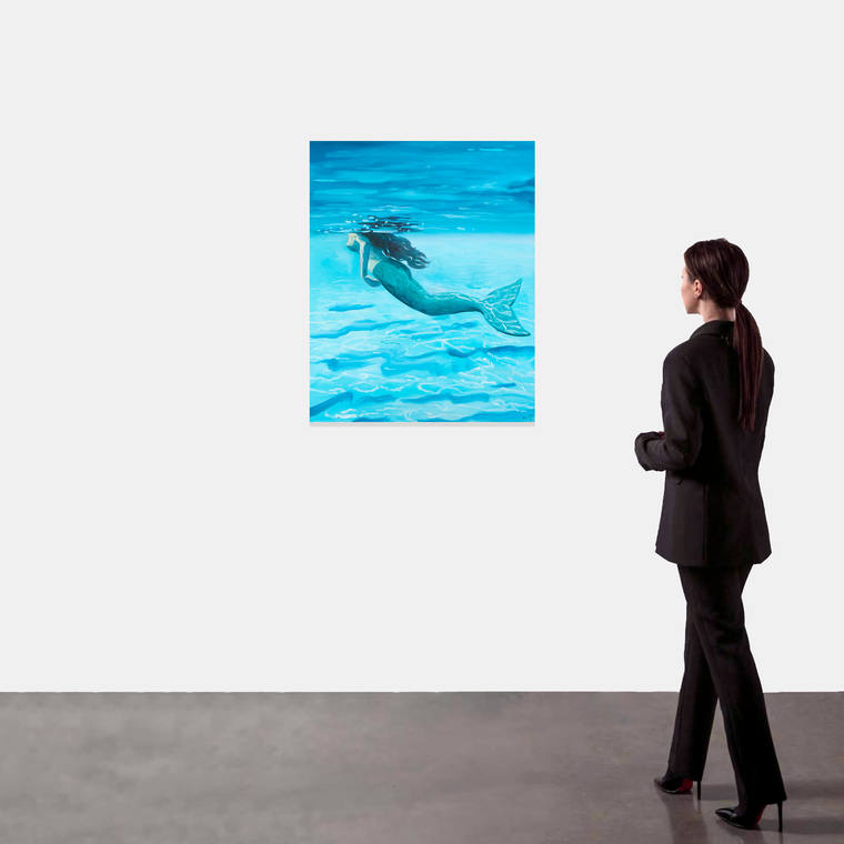 «Сказки — неотъемлемая часть народных традиций. Они меняются со временем, дополняются. Так появляются новые сюжеты и новые смыслы. Сказки дарят воображению автора, воображению зрителя — свободу, что так важна в моем творчестве. На картине мы видим русалку, которая скрывается от чужого взгляда. Русалка — узнаваемый образ, знакомый всем с детства. Но название серии подсказывает, что можно взглянуть на нее по-другому. Возможно, как на очень древнего персонажа мифов или легенд. Либо как на Лолиту, объект желания».