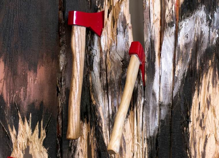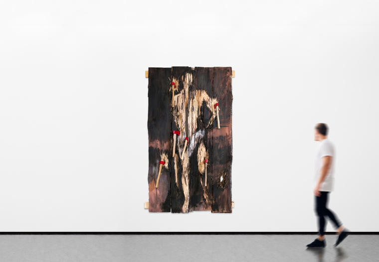 Традиционная иконография не допускала выражения христианскими мучениками экспрессии тела — драма страдания и казни разворачивалась исключительно в выражении лица. Поэтому художники прошлого часто допускали вольные трактовки именно в изображении тел героев христианских притч. В случае Святого Себастьяна мастера прошлого писали разнообразные формы стрел, что пронзают героя, и ран, оставленных ими. В представленной работе мученика буквально рубят на куски — религиозный образ мигрирует в сторону слэшера. По сравнению с тремя изображенными Тицианом стрелами, у Энгельке точно так же воткнуты два из шести топоров, а еще два оставлены за пределами контура фигуры для закрепления пространства. Художник превращает рельеф своей работы в горельеф. Сам по себе плотницкий инструмент с покрашенной в ярко-красный сталью появился в России в последние десятилетия и служит приметой современности, в отличие от традиционного топора с черным обухом. Оставляя напоказ орудие своего труда и превращая его в композиционный элемент, художник демонстрирует потенциал брутальности, присущий его работам. V