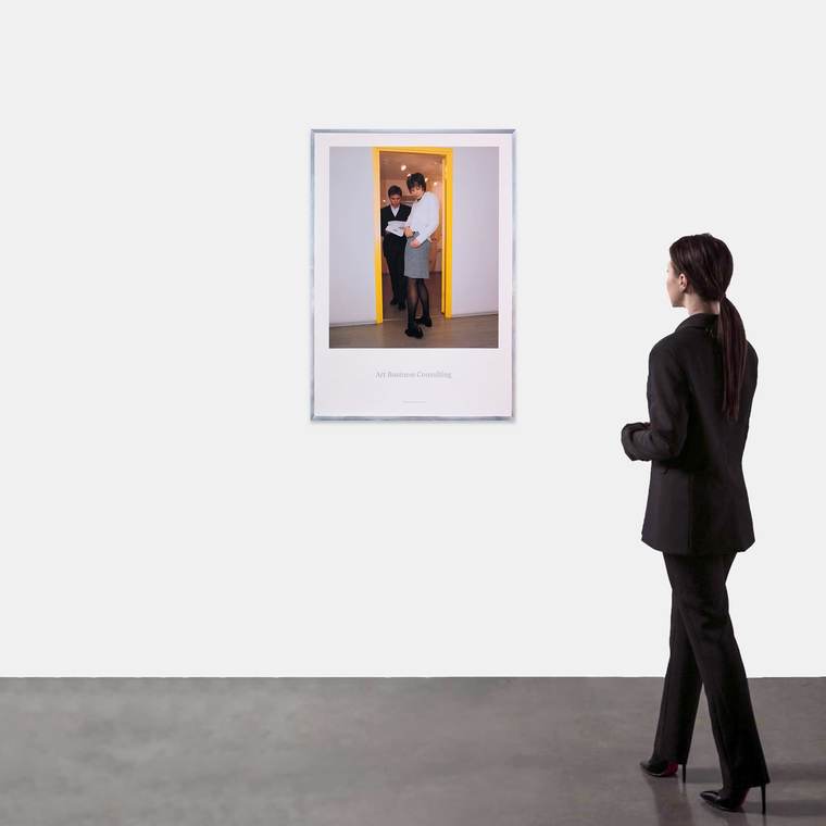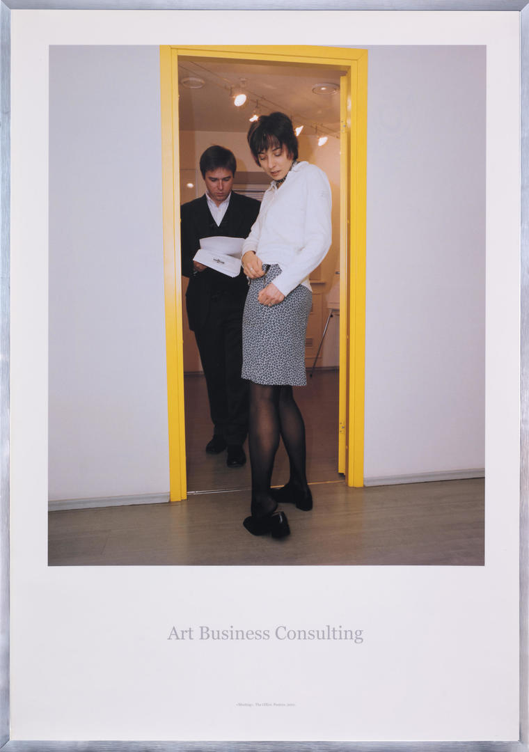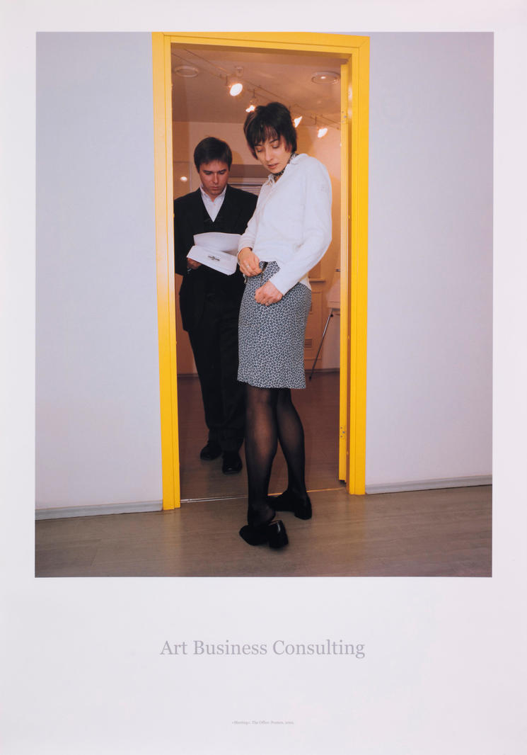 «Это был первый выставочный проект Наташи Стручковой, Максима Илюхина и Михаила Косолапова как объединения ABC. Работы художников группы посвящены корпоративной культуре, особенностям взаимоотношений в рабочих процессах и обыгрыванию офисной эстетики. Однако в своих работах ABC исследуют не только обстановку и офисное окружение. Участники группы рассматривают в первую очередь человека, чья работа, важные события и сама жизнь проходят в офисе. На этом постере мы тоже видим образ героя нашего времени — встреча в узком дверном проеме двух коллег, один из которых погружен в бумаги, а девушка незадачливо застегивает юбку, являет нам столкновение разных реальностей — бытовой и корпоративной».