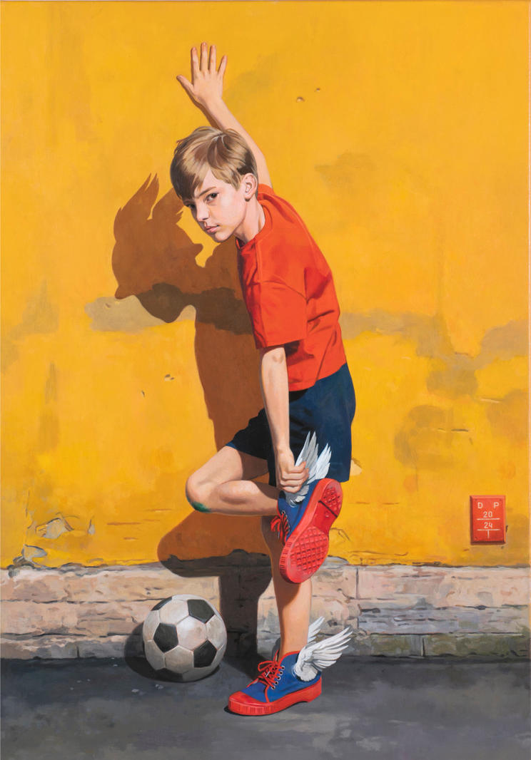 Обожествление героев — одна из традиций человеческой истории. В разные эпохи героями называют мессий, воинов, артистов, спортсменов и первопроходцев. Герои — полубоги на Земле — воплощают в себе все человеческие и сверхчеловеческие способности. На картине, вдохновленной одноименным рисунком Уильяма Блейка Ричмонда (1886), изображен совсем юный Гермес, который решил применить свои волшебные силы в игре в дворовый футбол с земными мальчишками. Он уже и сам практически превратился в обычного мальчика — осталось лишь поправить крылья на кедах и сделать их невидимыми для смертных, да вот тень на стене с головой выдает его божественное происхождение. Гермес оценивающе смотрит на команду своих соперников: сейчас они удивятся, сейчас он им покажет, какая у него скорость и точность удара, заставив признать – да, он играет как Бог!