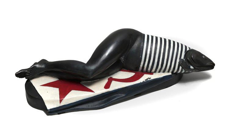 В начале двухтысячных годов Борис Орлов создает серию «Адаптация и приватизация классики европейского модернизма», в которой имперским мифом «обрастают» работы известных современных художников. Из этой же серии работа «Русалка», представленная на аукционе. Орлов воплотил в объёме «русалку наоборот» из картины Рене Магритта «Коллективное изобретение». Это полотно было написано в 1934 году, а изображает оно фантастическое существо — полуженщину-полурыбу. Все мы знакомы с легендами, повествующими о русалках, и каждый из нас имеет примерно одинаковое представление о том, как выглядят мифические обитательницы океана. Возможно, этот образ и явлется тем «коллективным изобретением», о котором говорится в названии. Скульптура — существо с ногами женщины и туловищем рыбы. Одета она в морскую тельняшку, а лежит на советских символах – звезда, серп и молот. Чем не памятник павшему герою? К тому же, как сказал сам художник, для него это произведение – аллюзия на соцреалистические каноны изображения поверженных в бою моряков. Интонация Орлова ироническая, но вместе с тем величественная. Сам Орлов вспоминает: «После того как был поднят железный занавес и мне удалось побывать во многих музеях современного искусства Европы и Америки, я исполнился печали по поводу отсутствия таких музеев дома. Я обратился к художникам с призывом самим воспроизвести такой музей и сделать ряд повторов, но непременно с личным акцентом, и сам начал серию "Приватизация и адаптация" мировой классики».