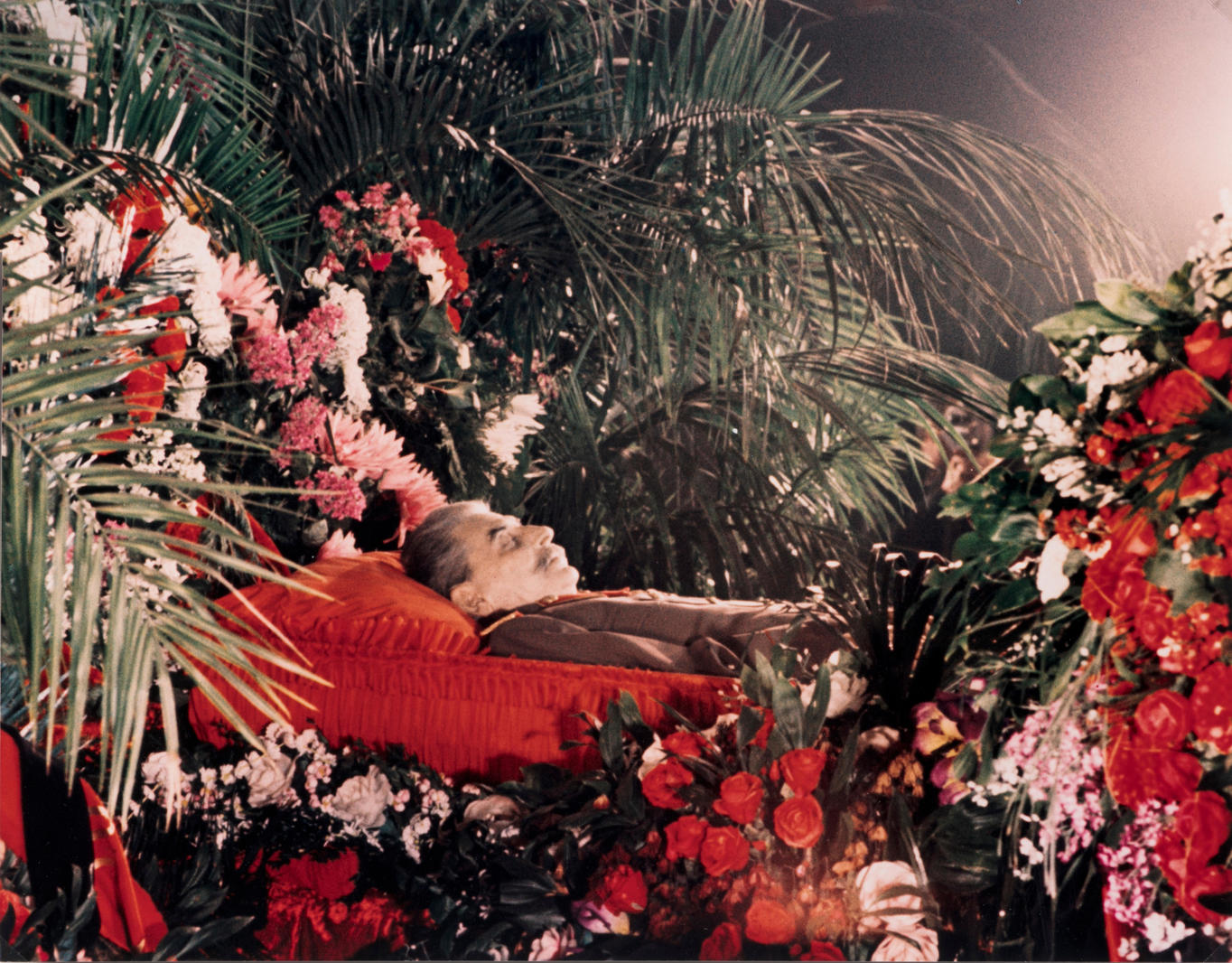 Из сотен снимков каждого из советских лидеров Бальтерманц выбрал по одному, наиболее полно проявлявшему личность персонажа: Хрущев азартно демонстрировал кукурузный початок; Брежнев широко раскидывал в приветствии руки; Андропов, похоронив очередного предшественника, исчезал из кадра; одинокий Черненко у накрытого стола тщетно ждал гостей; молодой и победительный Горбачев в сопровождении Рейгана шел по саду Белого дома; Сталину же автором была уготована роль реквизита в декорациях театрального спектакля. Декорации были выдержаны в подобающих случаю и личности усопшего алых и багровых тонах. Луч света, по диагонали пересекавший кадр, нес кому горестную, а кому благую весть. В поздней версии, разошедшейся по миру, Бальтерманц убрал присутствовавших в изначальном варианте членов Политбюро, стоявших с пустыми лицами слева и справа от гроба (полный снимок был опубликован на развороте №11 журнала «Огонёк» за 1953 год).
