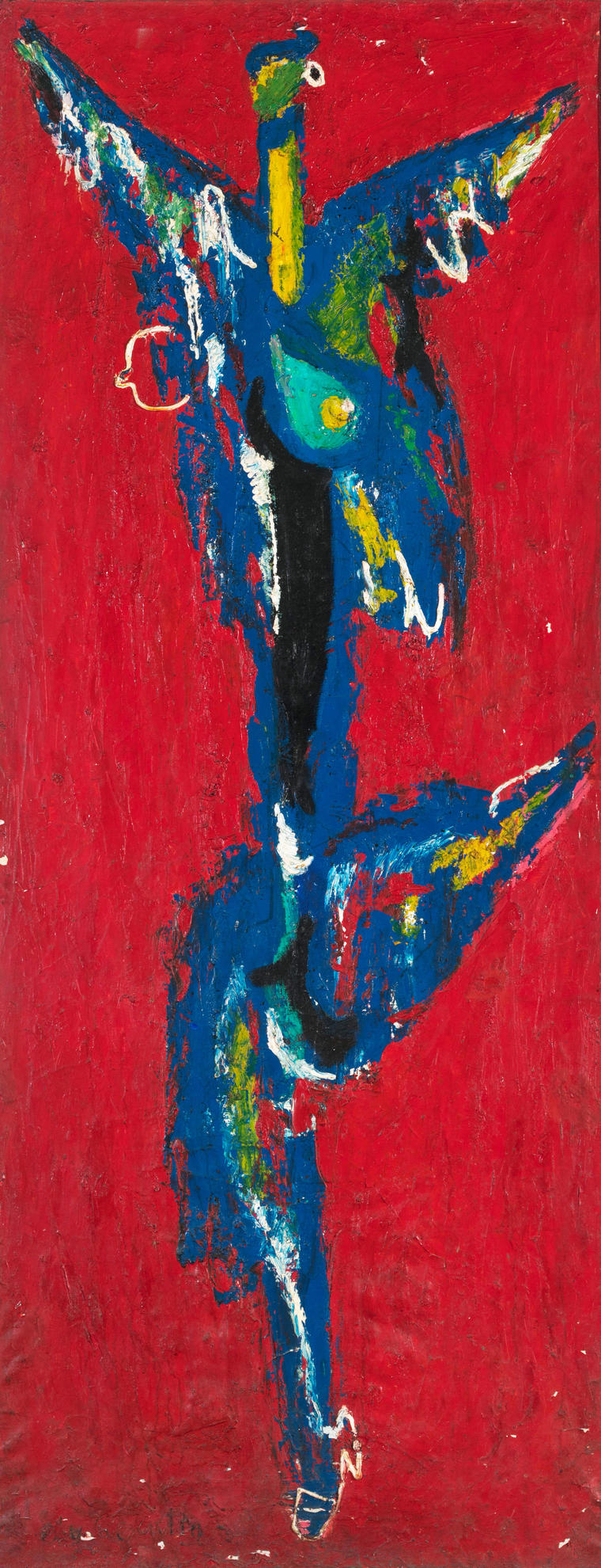 В отличие от повторяемых сюжетов Олега Целкова, картина «Ребенок с шариком» почти единичная во всем его творчестве. Но портрет архетипичен, мы бы точно смогли найти такой в чьих-то семейных фотографиях. В мире Олега Целкова этот ребенок — уменьшенная копия его «морд»: массивное тело, та же застывшая маска с низким лбом, отвисшей челюстью и сверлящими зрителя глазами. Он часть своего «племени», с детства уже бесповоротно такой же. В этом обнаженном теле чувствуется звериная мощь. Персонаж словно выступает из картины на зрителя, сияющий энергией солнечных оранжево-красных оттенков, пышущий жизнью и теплом. Воздушный шарик в его руке как цветок из плотного шелка на тонком изогнутом стебле, мерцающий словно сапфир в темноте — пожалуй, и крепкая квадратная может быть не лишена изящества.