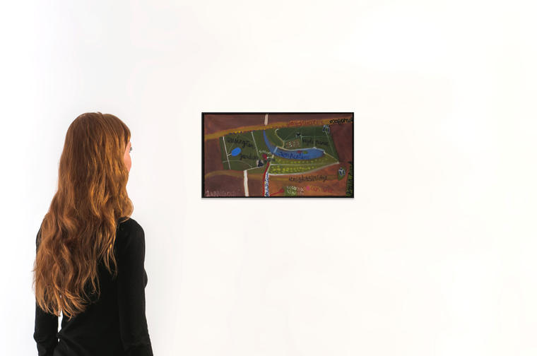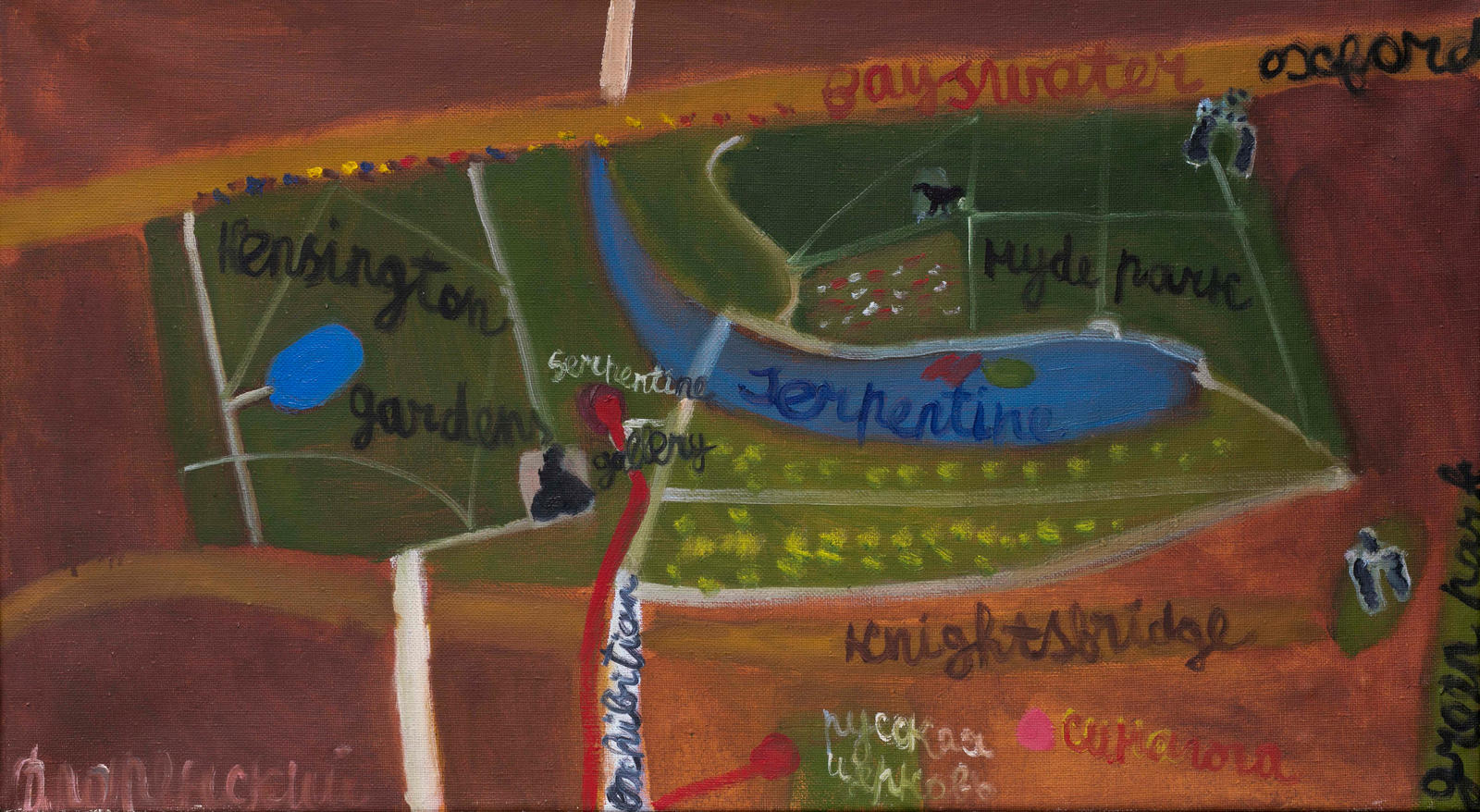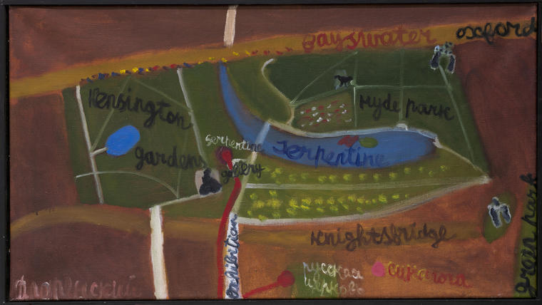 «На картине изображена своего рода «карта», на которой отмечен маршрут моей вполне конкретной прогулки в Лондоне. Схематическая, но точная география. Картины из этой серии были выставлены на моей и моей жены Ольги персональной выставке, сделанной во время той же поездки в квартире нашего друга Дмитрия Боски. Выставка называлась “THE BEST NIGHT FOR FISH & CHIPS”. Это была такая ирония, воспоминание о нелегальных квартирных выставках 1980-х в Ленинграде и Москве».