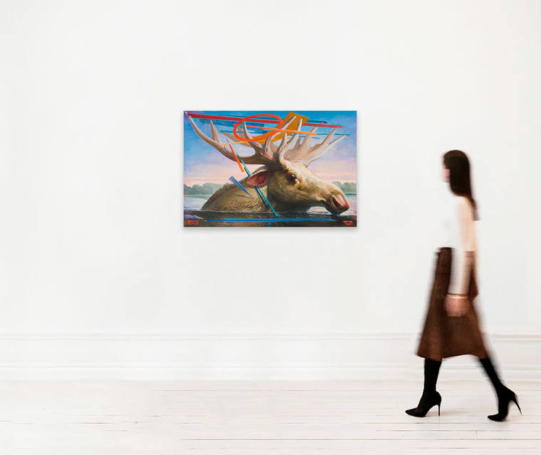 «Этот лось задумывался, как и прочие живые существа в моих работах — как жертва со стороны живой природы, который неминуемо сталкивается с культурой. Он волею судеб, сам того не желая, оказался в сплетении супрематических форм. Он входит в серию «Любовь и ненависть к модернизму». В сущности, речь здесь не идет о привычных методах апроприации и постмодернистского цитирования. Используя язык европейской объемно-пространственной живописи, я создаю в пространстве картины принципиально иные ситуации общения с современным искусством.