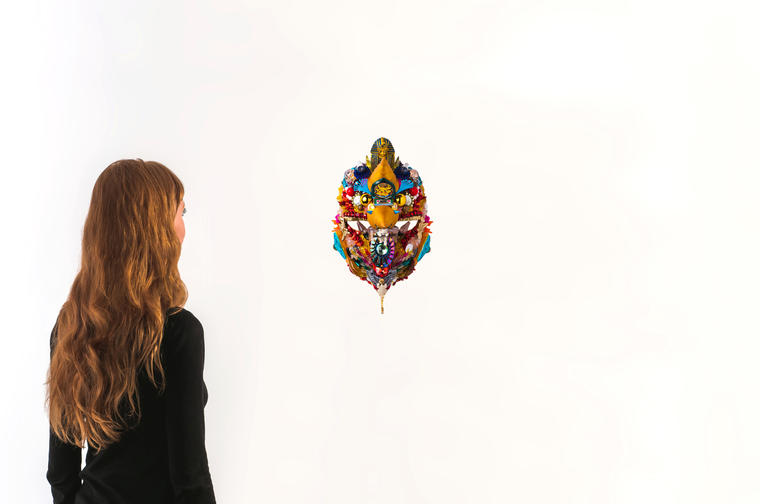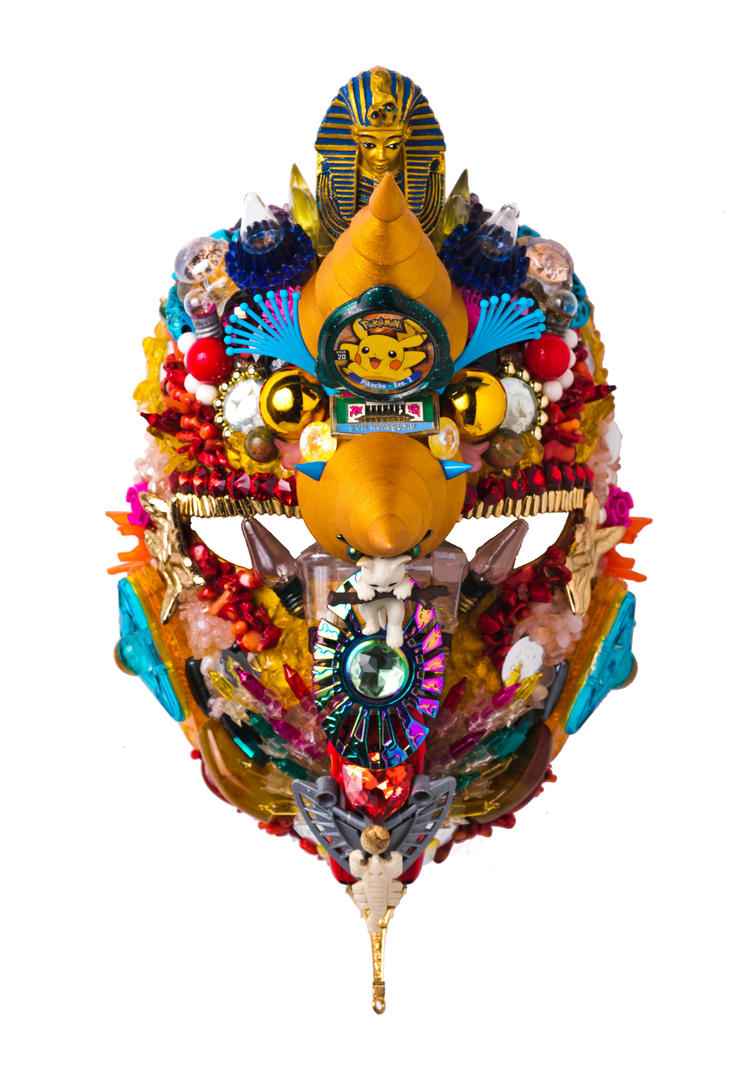 Если в древние времена маски использовались как предмет устрашения или возможность скрыть, изменить свою внешность, то в работах Дмитрия Шабалина они превращаются в автопортреты современности, но не пугающие, а скорее гипнотизирующие своей яркостью. Художник создает объекты-маски из найденных предметов, превращая их в нео-артефакты современности. Представленную маску наполняют знаковые элементы: от советских игрушек вроде лисы до современных спиннеров и пластиковых очков. Художник характеризует свой стиль как «космическое китч-барокко», а метод называет «иррациональным ресайклингом»: в его работах старинная карнавальная эстетика соединяется с поп-культурными образами, вызывая у зрителя чувство припоминания чего-то знакомого, уже пробравшегося в подсознание. Автор основывает свою практику на воспоминаниях из детства и сновидениях, рассказывая особую историю о пересечении реального и воображаемого, архаичного и нового. Дмитрий Шабалин активно сотрудничает с миром моды как с еще одной неотъемлемой частью современной культуры — его работы можно увидеть во многих модных съемках. В 2017 году он принял участие в Международной биеннале декоративно-прикладного искусства в Париже. V