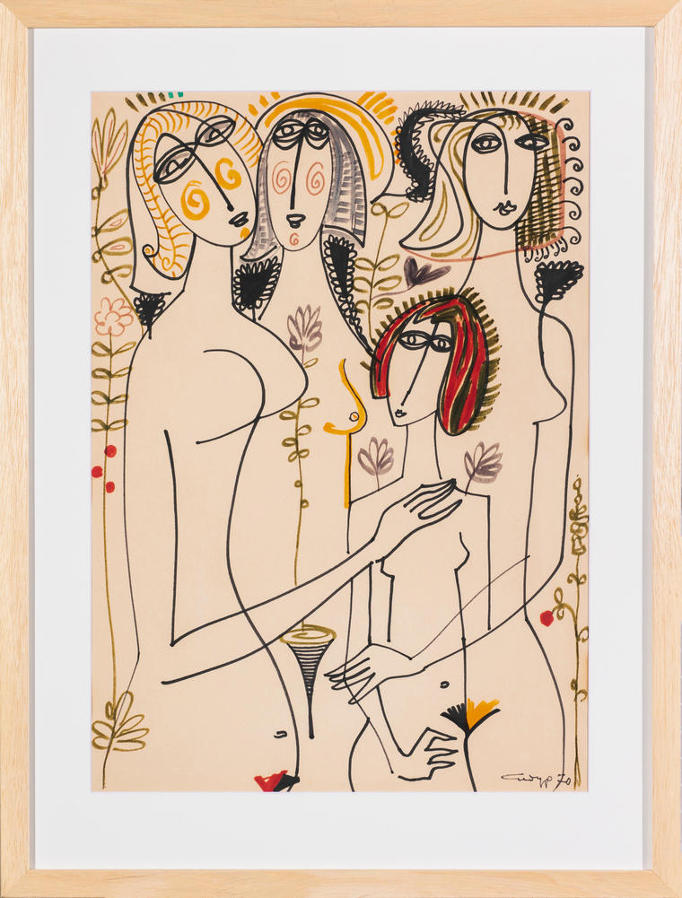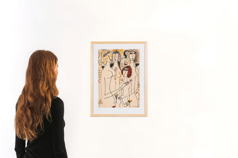 Фигуры женщин, нарисованные текучими, непрерывными линиями, как бы вплетены в декоративный орнамент из стилизованных растений. Они не существуют отдельно от фона — напротив, фон становится частью их телесности, отражением их внутренней гармонии. Цветочные элементы здесь не просто украшение, а выражение той симбиотической связи человека и природы, которую Сидур настойчиво проповедует в своём графическом цикле.