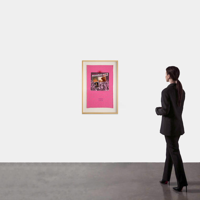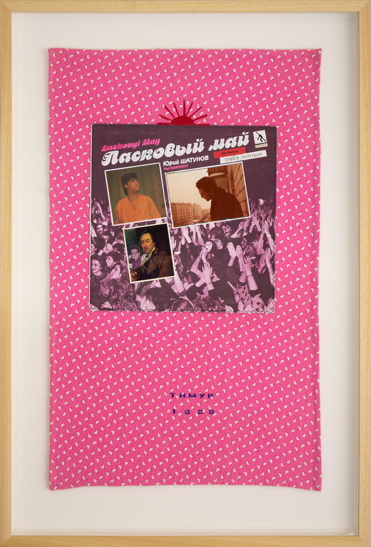 В характерной для него ироничной манере Тимур Новиков видоизменяет в этой работе обложку пластинки мегапопулярной в конце 1980-х группы «Ласковый май». На конверте рядом с кумиром юных девушек Юрой Шатуновым вместо фотографии продюсера группы Андрея Разина он помещает собственное фото, сопровождая его двумя вырезками со своим именем, напечатанным латиницей. При этом сам Тимур предстает на фото в образе меланхоличного и утонченного молодого человека, «строгого юноши», в соответствии с определенными эстетическими представлениями людей его круга (Константин Гончаров, Алексей Соколов, Георгий Гурьянов и др.) в те годы. В это время он общается с кумирами совсем иного толка – Виктором Цоем и музыкантами группы «Кино», которая успешно конкурировала тогда с «Ласковым маем», представляя противоположный музыкальный полюс. Второе фото, дополнившее обложку – это коллаж с изображениями двух Новиковых, Тимура и его однофамильца Николая Новикова, жившего в XVIII веке. Современный художник соединяет собственную фотографию с работой известного русского живописца Дмитрия Левицкого, написавшего портрет журналиста, писателя и книгоиздателя Николая Новикова в 1797 году (в коллекции Третьяковской Галереи). Вырезка с именем Николая Новикова, напечатанным латиницей, приклеена в правом верхнем углу обложки. Там же на месте логотипа фирмы «Мелодия» красуется персонаж из художественного арсенала Тимура Новикова – жнец с серпом, образ которого решен в духе авангардных «Окон РОСТа» начала 1920-х годов, служивших источником вдохновения ленинградским авангардистам уже конца ХХ века. Над обложкой восходит солнце – еще один характерный образ для творчества Новикова тех лет, часто появляющийся на его знаменитых «тряпочках». Первые работы в технике аппликации на ткани, ставшие его визитной карточкой, художник начал создавать в 1987 году как практическое воплощение разработанной им «теории перекомпозиции». Ткани Новикова в конце прошлого столетия отражали новую визуальность компьютерной эры: плоский экран с лаконичными изображениями — «иконками», которые чаще всего наносились им по трафарету. По характерному трафарету, известному каждому школьнику конца советских времен, наносилась также подпись автора и дата произведения. Фоном для альбома «Ласкового мая» с его любовной лирикой здесь служит розовая ткань с белыми сердечками, подобранная в колористическом соответствии с цветом надписей на обложке пластинки.