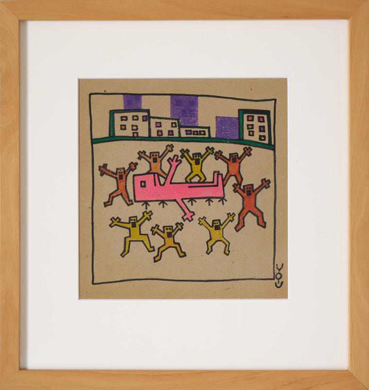 В его работах, характерных для второй половины 1980-х годов, главными героями становятся человечки геометризованной формы, нередко предстающие в сценах, носящих агрессивный характер. Возможно, выбранная им стилистика была результатом влияния венгерских и американских комиксов, которые привозили своим ленинградским друзьям Агнеш Хорват и Джоанна Стингрей. Благодаря Стингрей, Цой также был знаком с творчеством мастеров американского поп-арта и с работами Кита Харинга, создававшего в те годы схожие по стилю произведения. Интерес к подобному искусству люди, близко знавшие музыканта, связывали с его стремлением к творческой свободе, которой ему не хватало ранее в художественных учебных заведениях. Не исключено, что на рисунки Цоя также оказал влияние стиль трафаретных плакатов, созданных в начале 1920-х Владимиром Маяковским (Окна РОСТА), ставшим культовой фигурой в среде ленинградских музыкантов и художников 1980-х. Одним из таких рисунков является представленный на торги лот. На фоне условного городского пейзажа торжествующие человечки празднуют победу над великаном, напоминая лилипутов, окруживших Гулливера. Хотя поднятая вверх рука великана может отсылать к образам популярных в СССР памятников Ленину, а сама композиция олицетворять крах коммунистических устоев в эпоху Перестройки, свидетелем чему были Виктор Цой и его поколение.