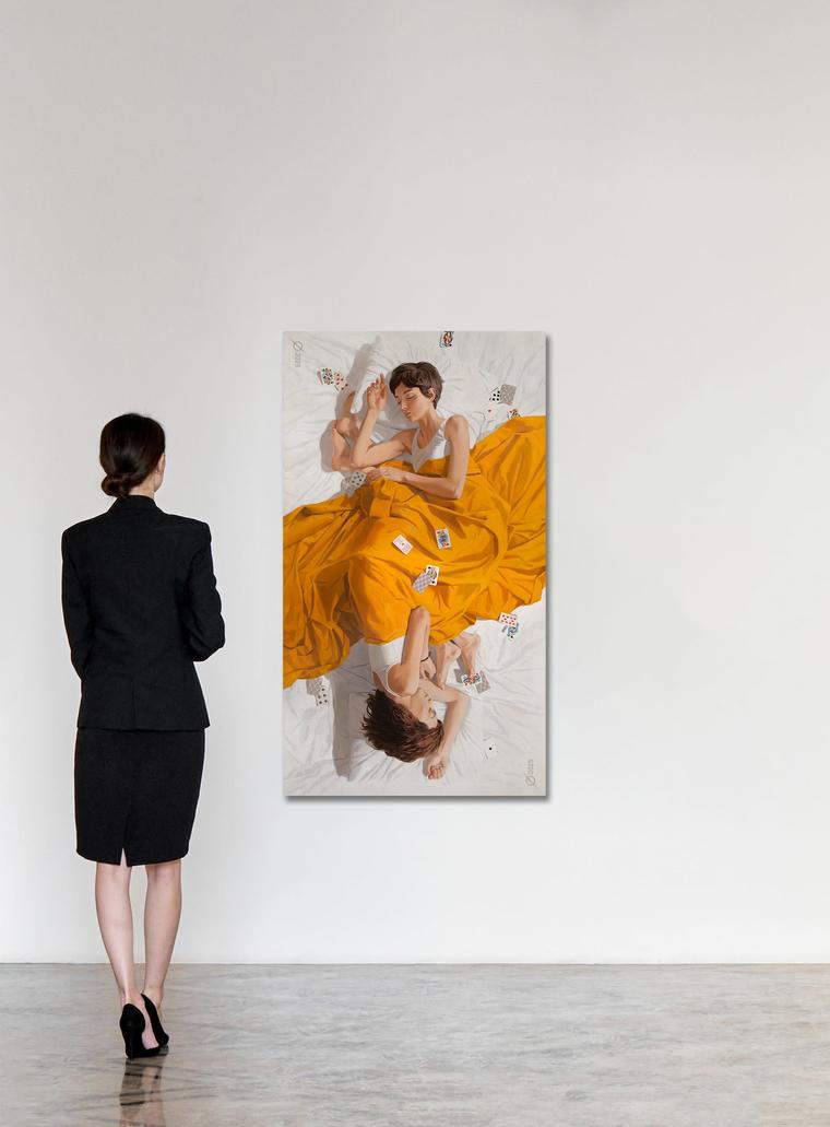 Героини нашей картины только что закончили игру и без сил свалились там же, где играли, уснув «валетом» среди беспорядочно разбросанных карт. И в этом хаосе они, приняв такую позу, сами превратились в персонажей игральной карты.