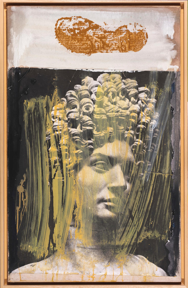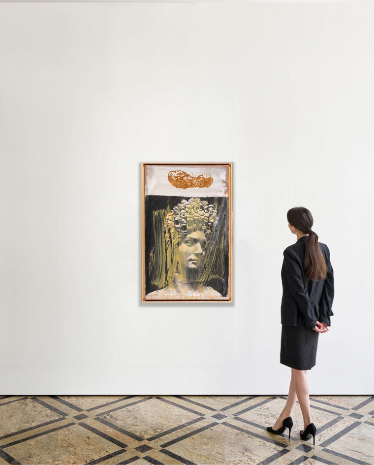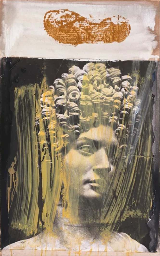 Жёлтые и коричневые слои краски напоминают следы времени, эрозию культурной памяти. Сквозь них проступает холодная мраморная поверхность, — как напоминание о величии, которое переживает века, но всегда оказывается под угрозой утраты. Коллажный элемент в верхней части работы усиливает ощущение многослойности истории и человеческого опыта.