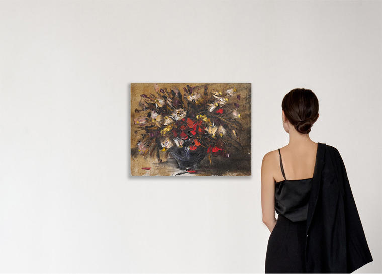 В представленном на торгах полотне 1991 года Лаврентий Бруни обращается к магистральной теме своего творчества — цветам. Работа выполнена в фирменной экспрессивной манере художника, нередко совмещающего работу кистью и мастихином.