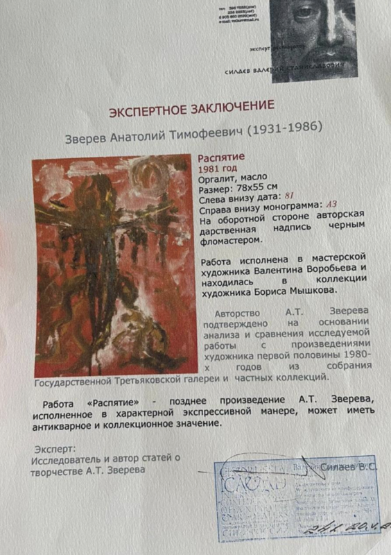 художника Бориса Мышкова. В этой картине художник обращается к теме страдания и духовной борьбы, используя традиционный христианский сюжет распятия. Зверев трактует его через призму экспрессии и эмоциональной насыщенности. Контрастные цвета и динамичные мазки создают напряжённую, почти вибрирующую атмосферу, делая образ трагическим. Картина отражает уникальный стиль Зверева, где традиционная тема соединяется с современной живописной манерой, превращая религиозный сюжет в мощное художественное переживание.