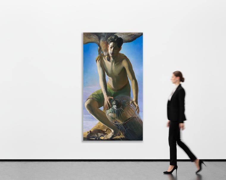 Картина «Птицелов» входит в цикл «Волшебная флейта», вдохновленный либретто Эмануэля Шиканедера для одноименной оперы Вольфганга Амадея Моцарта. Птицелов по имени Папагено, по замыслу либреттиста, — фигура подчеркнуто комическая. Работая с этим образом, я решил снять избыточный комизм и придать Папагено бо́льшую сложность, показав его одновременно и охотником, и добычей. В итоге возник своего рода Папагено-Ганимед (мифический юноша редкой красоты, похищенный обратившимся в орла Зевсом и сделанный, в конечном счете, виночерпием на пиру богов). В его лице античность и рококо срастаются воедино и переводятся на визуальный язык сегодняшнего дня.