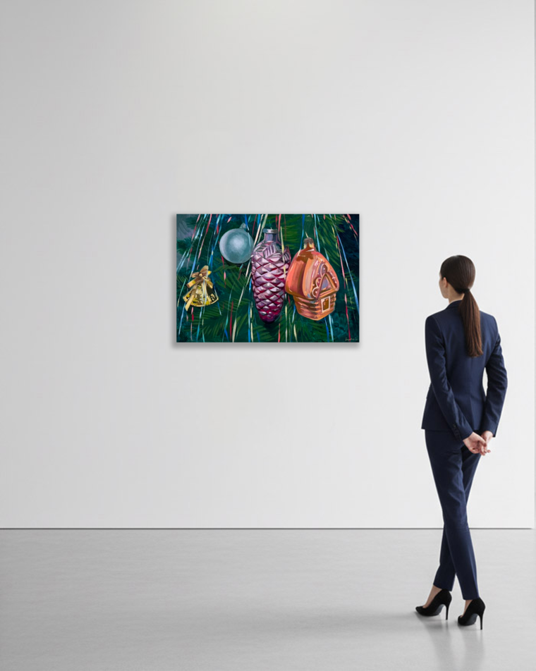 Приближение нового года особенно чувствуется, когда в доме появляется елка, и хочется вдыхать этот елово-мандариновый запах и любоваться красивыми игрушками и огоньками. Елка создает ощущение праздника, уюта, вошебства. В этой картине я увеличила пару игрушек, изобразила их монументальными (а значит более значимыми) и сразу появилось больше блеска и праздник стал почти осязаемым, будто вовсе не мы создаем этот праздник, а Новый год сам приходит в дом к каждому.