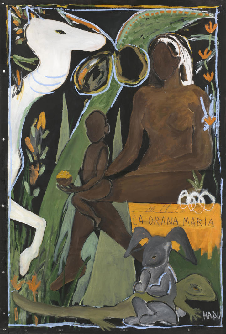 «LA orana MA ria 2 — это мои размышления на тему передачи опыта, учительства, заботливого наставничества. Тибетцы переводят лама вот так: «ла» означает непревзойденный или наивысший, в то время как «ма» значит мать. Ламы напоминают матерей, заботливо поддерживающих своих учеников на пути духовного развития. Изображённая на картине женщина, мать, поддерживает на коленях дитя, подпирая его и поддерживая в нем его внутренний стержень. Мадонна с младенцем в моем понимании и интерпретации».