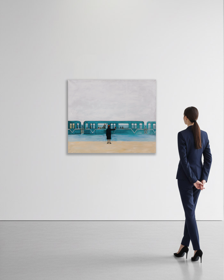 Работа относится к периоду моего творчества, в направлении магического реализма, с сюрреалистическими включениями. Любимая тема метро. Движение, повседневность, случайные попутчики, берег. Работник метрополитена (или ангел) подает сигнал.Эта работа появилась в сознании, как кадр. Со всеми деталями. Оставалось только всё это нарисовать.