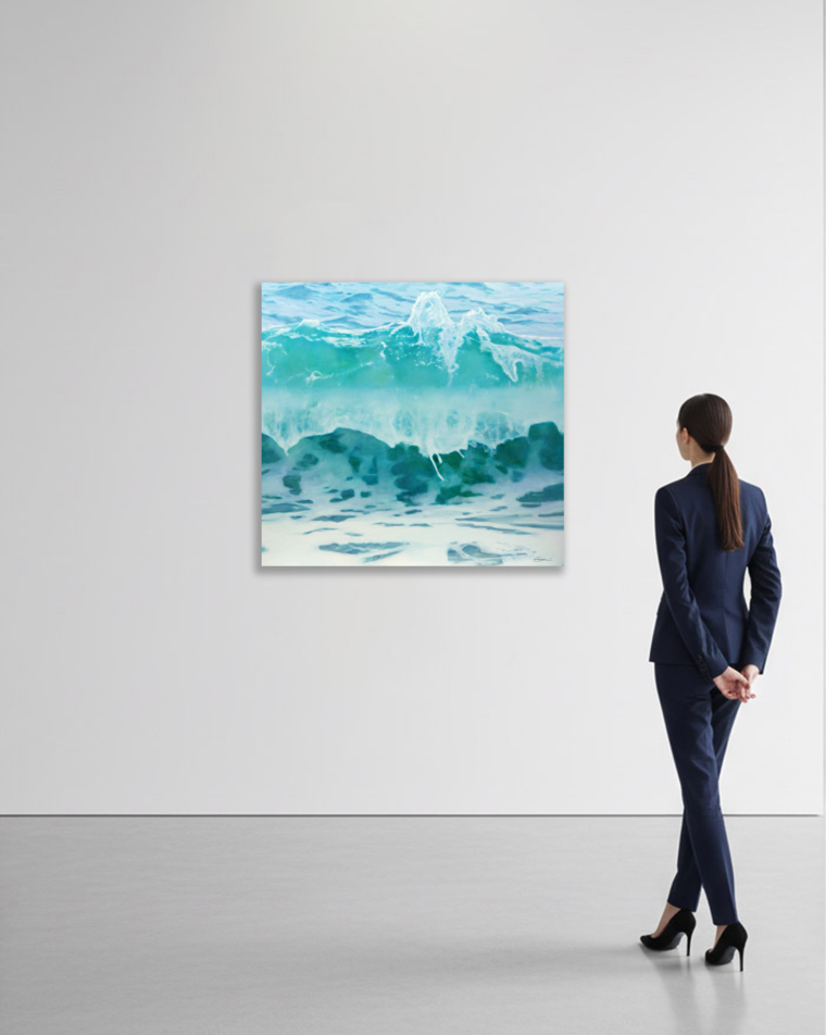 Эта работа продолжает серию картин из цикла «Дао воды». Если в предыдущих работах сюжетом была спокойная вода, вода с отражением облаков или текущий ручей, то сейчас я исследую изображения движущейся воды в её ежесекундно меняющемся состоянии, в бесконечном разнообразии форм.