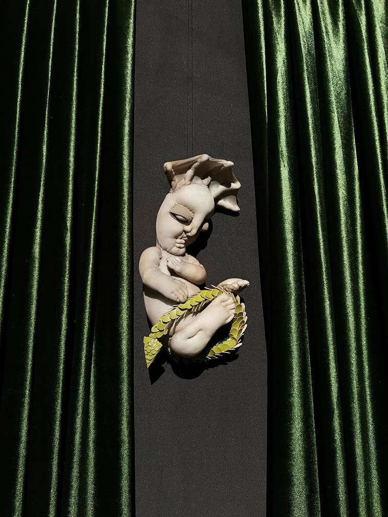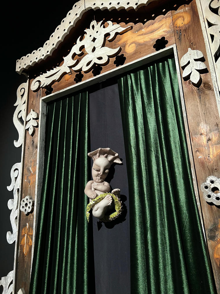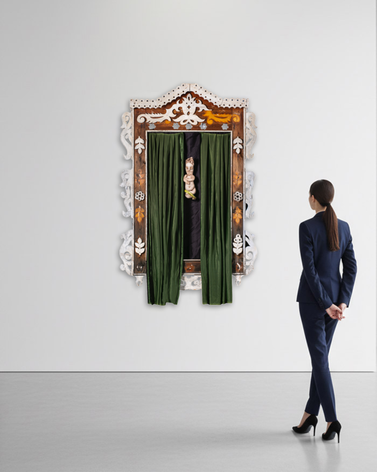 Эта простая бытовая магия и воспоминания из детства пробудили во мне желание отдать дань культуре украшения окон. Так родилась серия “Магических наличников”, внутри которых я помещаю уже не бытовые сцены, а свои персональные символы. Мне нравится образ загадки, я всегда украшаю свои наличники бархатными шторами, а в центр помещаю некий сакральный объект, будь то слеза как символ боли или птица как символ надежды».