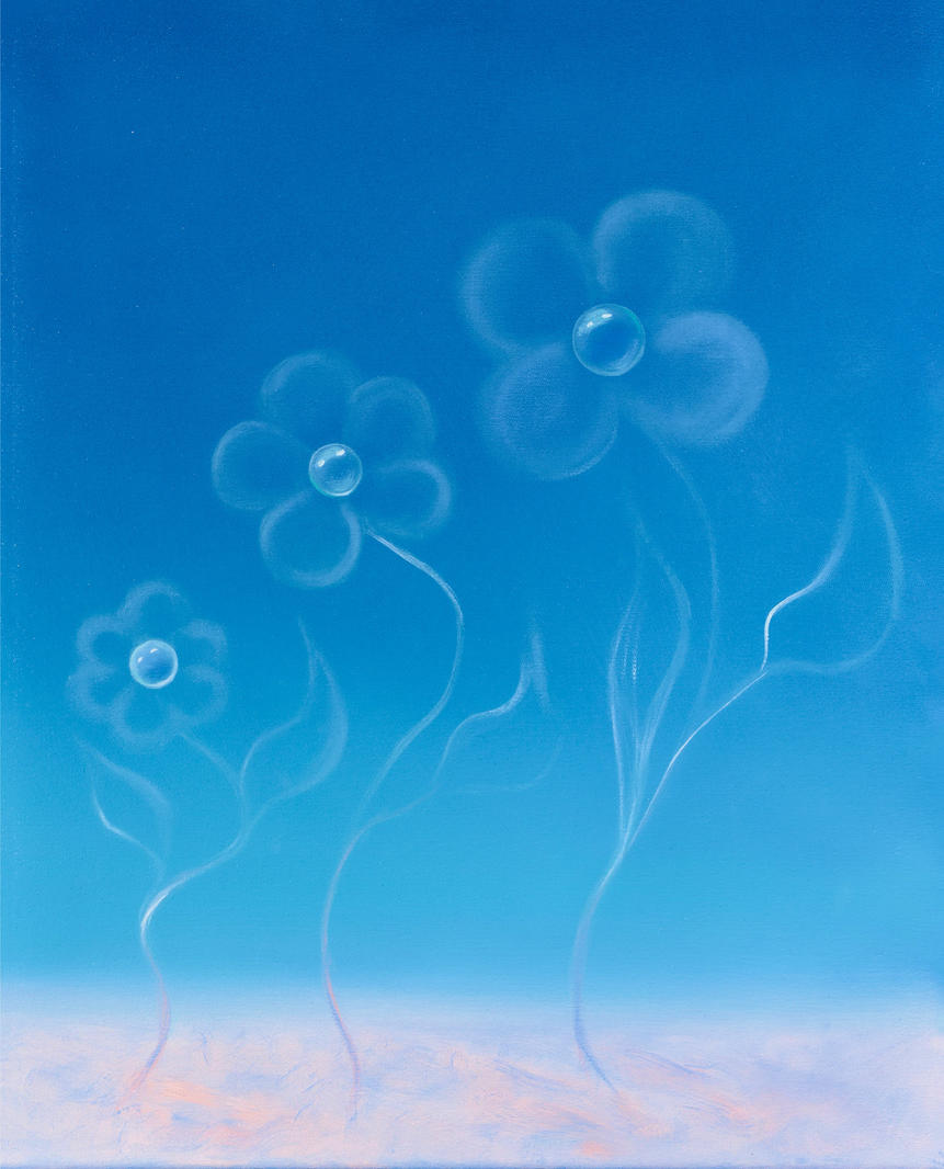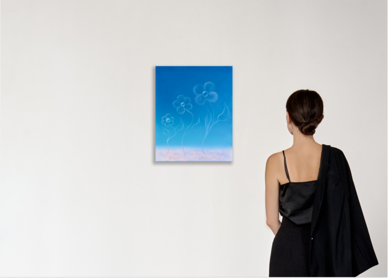 Цветы на холсте лишены декоративной устойчивости: они существуют как прозрачные, подвижные структуры, возникающие на грани проявления и растворения.