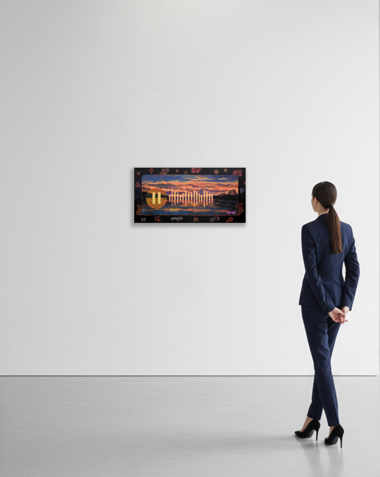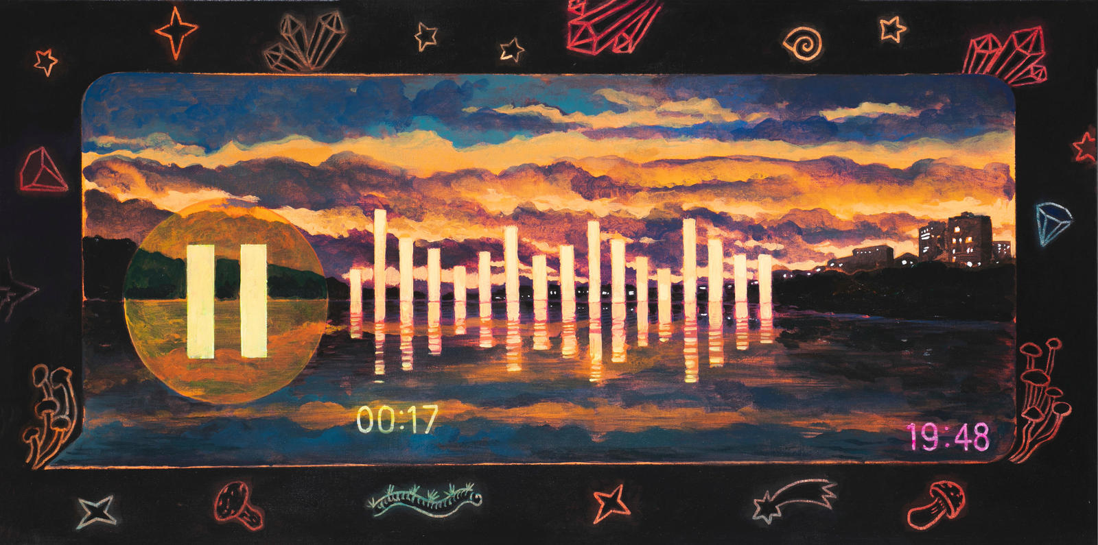 В работе «Аудиопейзаж. Мост» Дамир Муратов соединяет романтический городской закат с визуальным языком цифровой коммуникации. Живописный вид моста, отражающегося в воде, наложен на интерфейс голосового сообщения. Этот приём характерен для художника: он сталкивает разные культурные регистры — поэтику традиционного пейзажа и повседневную эстетику мессенджеров, создавая одновременно ироничный и лиричный образ. Работа легко читается как визуализированное любовное послание: мост становится метафорой связи между двумя людьми, а «аудио» — знаком интимного, адресного признания. Романтика здесь существует в современной форме — как сообщение, отправленное в сумерках и сохранённое в памяти экрана.