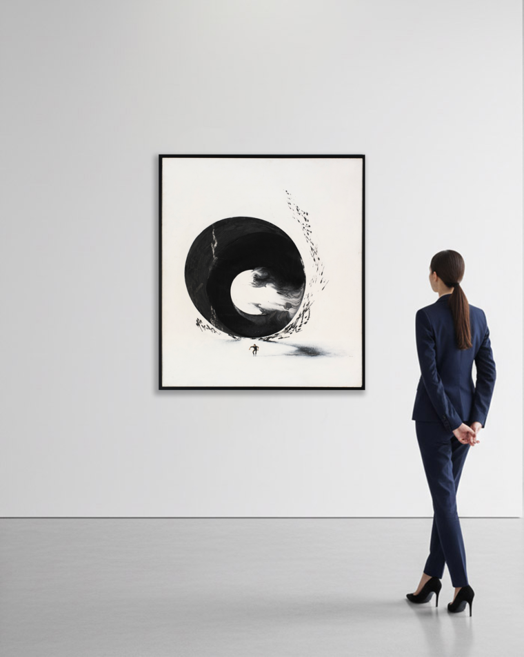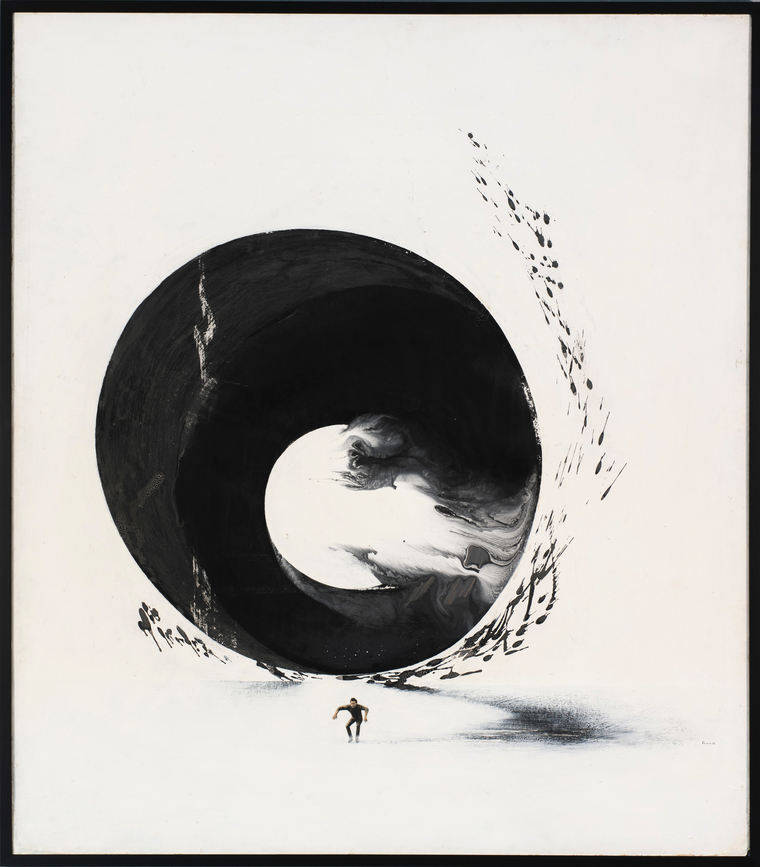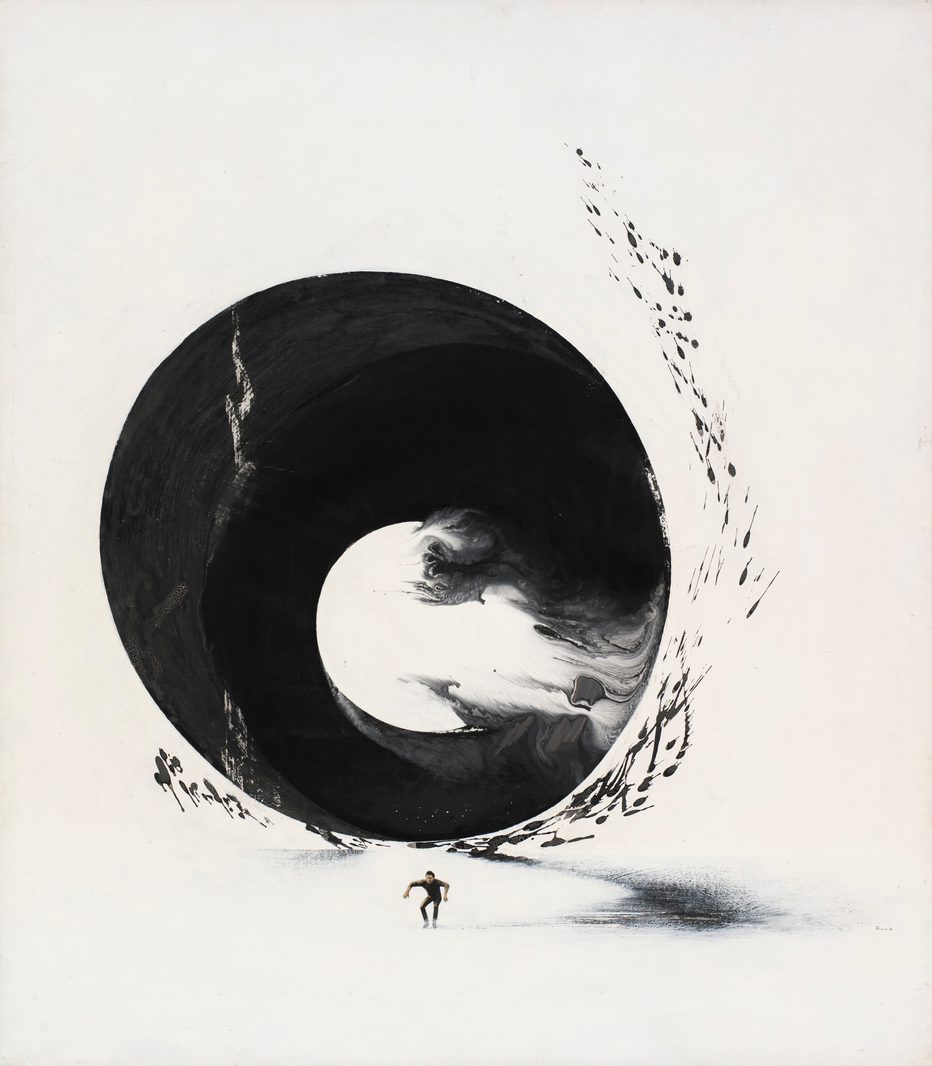 К 1980-м годам в работах Беленка появляется особое чувство уязвимости. В представленном произведении небольшая человеческая фигура оказывается преследуемой абстрактной силой — масштабным черным пятном, в центре которого вырисовывается белый силуэт медузы. Ровный полукруг белой краски плавно растекается по поверхности, вытягивается в мягкие линии и в итоге становится почти проницаемый. Так получается живая, словно нерукотворная форма, превращающаяся в большую белую медузу. Произведение 1988 года являет собой крайне редкий пример работы художника с анималистикой. Здесь его космос оказывается не безжизненным пространством, а местом со своей особой фауной.