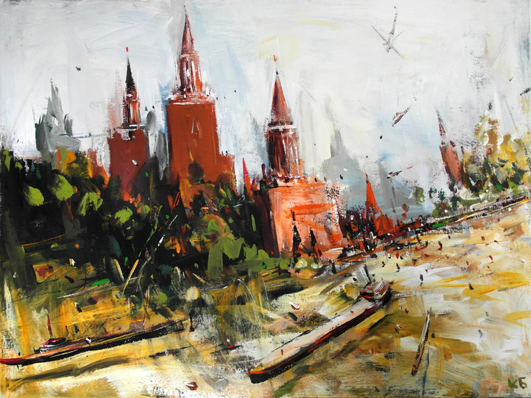 В работе «Москва — порт пяти морей» как раз сочетаются все описанные элементы, важные для моего творчества. В конце 2009 или в начале 2010 года мне предложили принять участие в предполагаемой в Московском музее современного искусства выставке под названием «Москва — порт пяти морей». В то время для сложных композиций, включающих в себя морские сюжеты, я использовал несколько различных конструкций картины. Одной из новых, исследуемых мной в то время, стала довольно редко используемая в живописи структура правильного ромба. В этой конструкции визуально инертные диагонали квадрата (которые и прямоугольной картине поддерживают в основном лишь перспективные построения) занимают место двух важнейших пространственных координат нашего восприятия — горизонтали и вертикали. Они не только начинают оптически работать на пространство картины, пытаясь расширить его (провоцируя мысленное достраивание) за пределы сторон, но и создают сильнейшую иллюзию увеличения собственного картинного формата. Мне представилось, что подобная пространственная экспансия ромба созвучна с заданной темой — расширением водных коммуникаций и водных пространств столь удаленной от морей Москвы. Я планировал написать большую картину со сторонами 189 сантиметров каждая, но предварительно, чтобы избежать переделок на большом холсте, я написал картину меньшего размера маслом на оргалите. По каким-то причинам заявленная выставка не состоялась, и большая картина так и не была написана, поэтому представленная на аукционе работа — единственная.