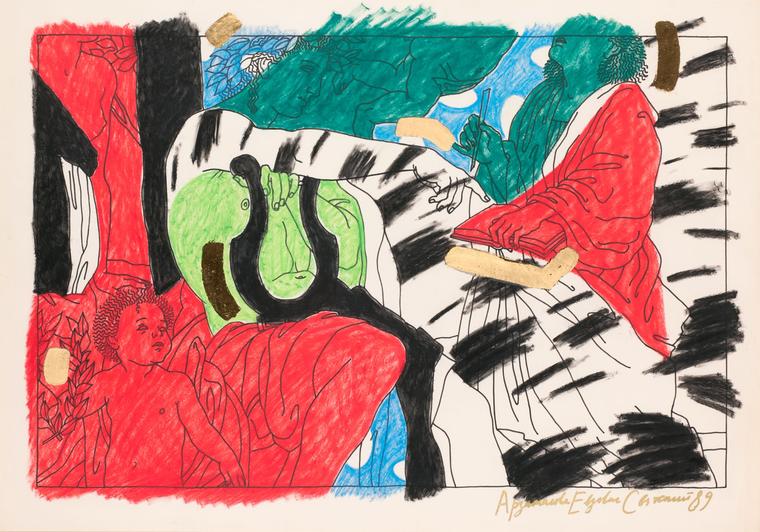 Листы в триптихе, представленном на аукционе, объединены цветовой гаммой — на основе сочетания ярко-красных фигур музы и поэта, светло-голубого фона и черно-белой, экспрессивно покрашенной фигуры Аполлона (художники условно называли эту палитру «павлиний хвост»). Отсылка к Пуссену в этом проекте не случайна: 1980-е — время переосмысления классики, на чем основывается все зрелое постмодернистское искусство. Все циклы AES этих лет обозначают программный поворот к фигуративной образности, цитатам из классики и структурной работе с языками изобразительного искусства. Уже в следующем десятилетии в практике многих художников это превратится в набор китчевых приемов и порой откровенный стеб, что — в отечественной истории — особенно ярко репрезентировано в деятельности Новой академии в Санкт-Петербурге. Группа AES же в своих работах балансирует на строгой грани элитарной отточенности и интеллектуализма с массовым вкусом. V