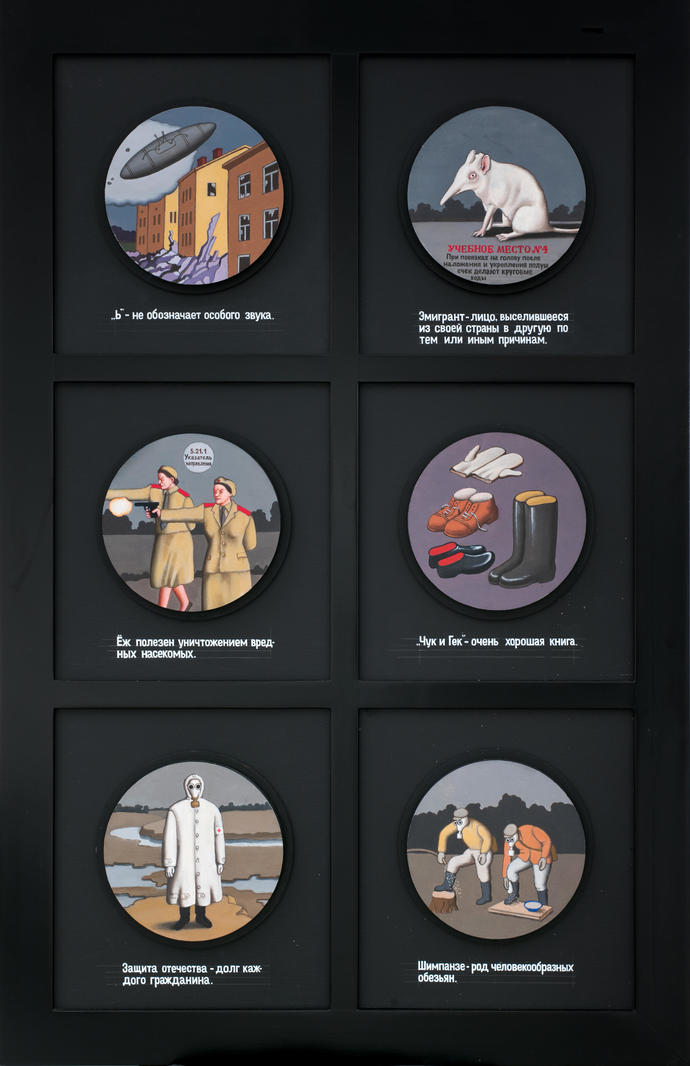 Живописные картины в серии существенно отличаются от изображений на фарфоровых тарелках. Здесь тексты написаны не по краям работ, а внизу, белыми буквами на черном фоне (при этом тексты встречаются и внутри изображений). Они не носят поясняющего характера, скорее, наоборот, усложняют восприятие этих жестких и лаконичных образов, делают их соединение абсурдным. Нельзя не отметить холодной иронии, которой пронизаны все изображения. Брускин свидетельствует о распаде языковых структур времен противостояния двух глобальных миров в эпоху холодной войны, и в то же время об их тотальной силе воздействия, которую в том числе фиксировали в своих произведениях многие художники, обращавшиеся к стилю поздней советской власти: Илья Кабаков, Виталий Комар и Александр Меламид, Игорь Макаревич и Елена Елагина. Каждую из составных композиций в серии художник бережно компонует так, чтобы совмещались контрастные образы: и фигуративные композиции (например, персонажей в противогазах), и своего рода натюрморты (обувь и аксессуары в композиции «“Чук и Гек” — очень хорошая книга»), и по-своему величественные пейзажи с руинами постъядерного мира (композиция «Ь — не обозначает особого звука»). Особое место уделено «бестиарию» — изображениям животных. Брускин как бы собирает разные жанры в своей составной картине, представляя их в отстраненном взаимодействии между собой и со зрителем. В этом смысле картина подводит своего рода итог событиям и страхам уходящего столетия и делает это так, чтобы герметичный язык советской властной машины превратился в один из языков современного искусства.V