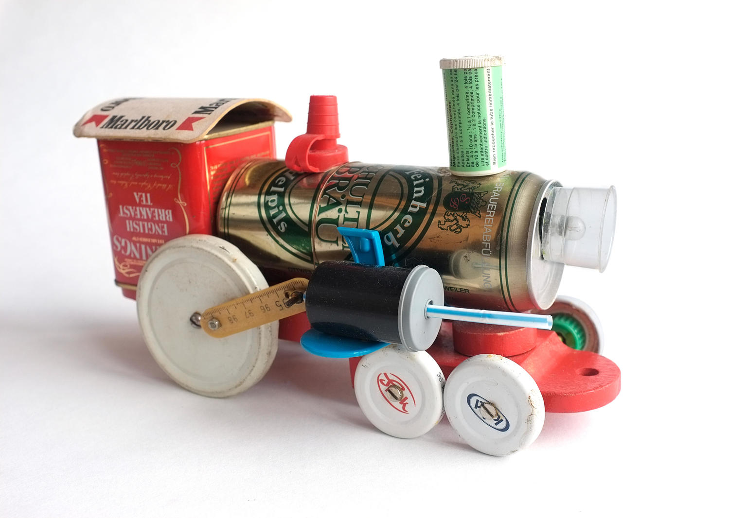 Владимир Архипов о работе: «Саша Чеботарев — мой товарищ по работе в авиационном НИИ. Мы когда-то вместе трудились на благо нашей авиации, а потом, в начале девяностых, меня занесло в искусство, а его — в продуктовый бизнес. Мы какое-то время не виделись, так как я жил в Москве, а он в Жуковском. И когда однажды встретились, то продолжили у него дома за рюмкой чая. Хотя мы и выпили как следует, но по сторонам я смотрел тогда уже почти профессионально: эклектика этого паровозика бросалась в глаза на фоне нормального дизайна других игрушек его сына. В тот момент у меня не было с собой диктофона или видеокамеры, поэтому привожу наш короткий разговор про паровозик по памяти. Заполучить этот паровоз оказалось непросто: мне пришлось купить и подарить подобный, ждать лет десять, прежде чем его сын вырос, женился и потерял интерес к своим игрушкам».