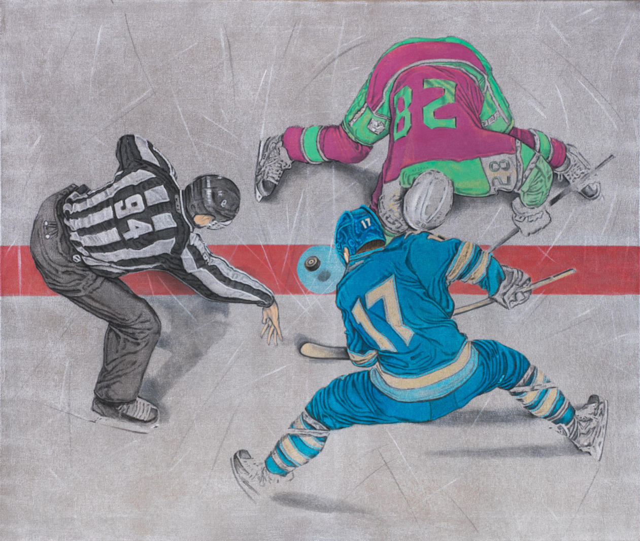 В представленной работе Денис Егельский обращается к спортивному сюжету. Художник изображает момент начала хоккейного матча, когда судья должен вбросить шайбу между клюшками спортсменов. Хоккеисты стремительно разворачиваются, готовясь бороться за возможность ударить по шайбе первыми. Все персонажи изображены в сложном ракурсе сверху — как обычно смотрят матчи с трибун зрители. Фоном становится серебристый лёд с тонкими росчерками от коньков, на фоне которого выделяются яркие динамичные фигуры. Широкая полоса красной разметки, пересекающая холст посередине, уравновешивает всю композицию. V