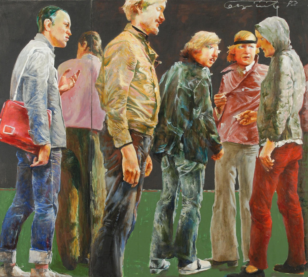 Между двумя вариантами картины существуют значительные различия: в количестве персонажей, пространстве, характере освещения. Так, в представленной картине можно узнать несколько героев: крайний слева — сам автор, а четвертый слева (в кожаной куртке, спиной к зрителям) — Сергей Шерстюк. Композиция работы построена на жестком вертикальном ритме, который задают фигуры, расположенные в неглубоком пространстве. Герои — яркие представители своего времени: о моде конца 1970-х — начала 1980-х говорят и прически, и джинсы с отворотами (предмет особой гордости), и объемные куртки, и спортивная сумка, и кроссовки. Рассматривая их, мы можем вспомнить Ивана Мирошникова из «Курьера» (1986), ребят из фильма «Пацаны» (1983) или Рому Лавочкина из «Вам и не снилось» (1981).